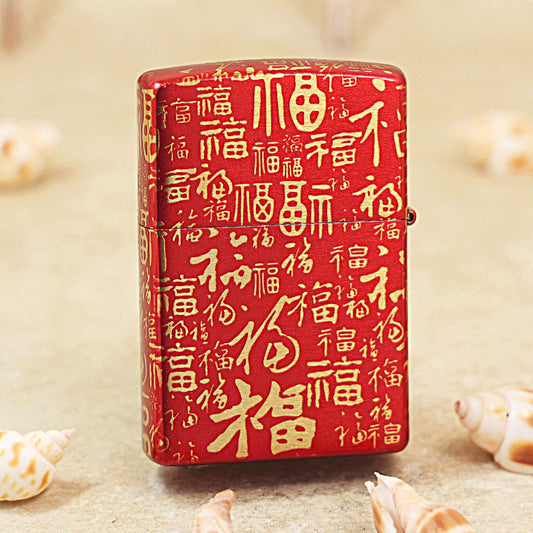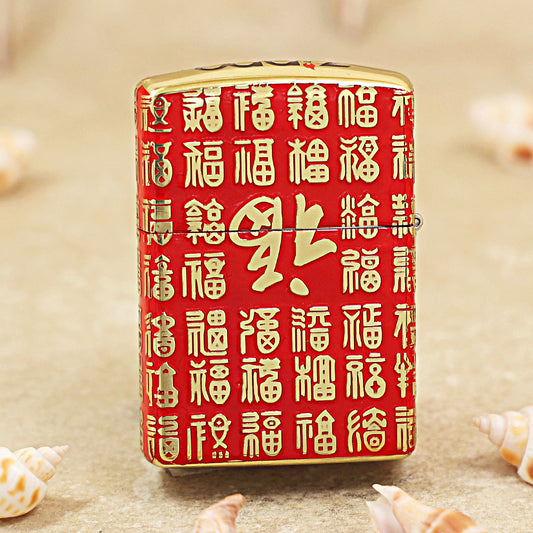 Zippo Red High Polish Gold Engraved Hundred Fu Characters - CS11
