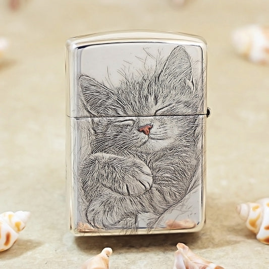 Zippo Sterling Silver Exquisite Carved Looking Up Cat Spirit Lighter - SS03