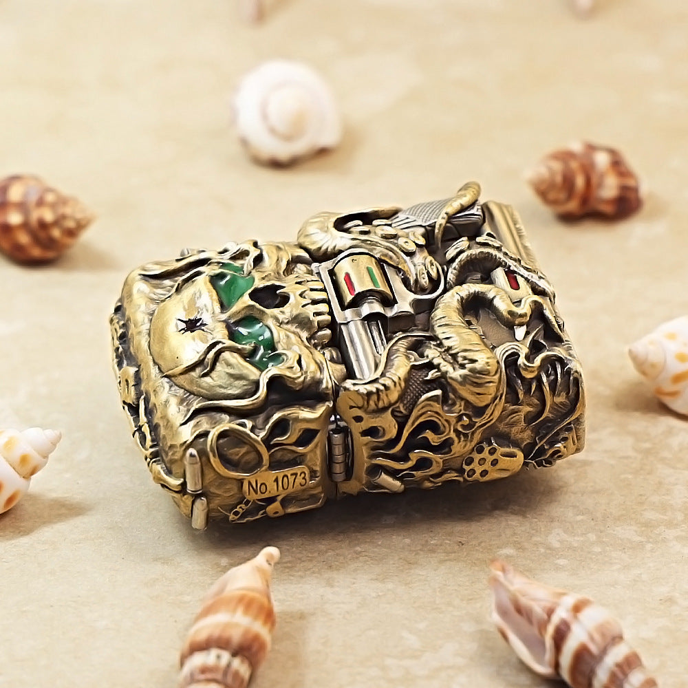 This Zippo lighter features a heavy-walled decorative armor shell fitted over a 205 base, finished in a weathered antique brass that emphasizes its dark, cinematic detail. The top half of the shell showcases a menacing, high-relief skull with glowing green translucent eyes and a bullet hole in the forehead, surrounded by ethereal, flame-like whisps. Below, a detailed revolver is gripped by the suckered tentacles of an octopus that wrap around the body of the shell. This intricate 3D design combines elements of pirate lore and supernatural western themes, creating a formidable and highly tactile piece within the Nether Zorro series.