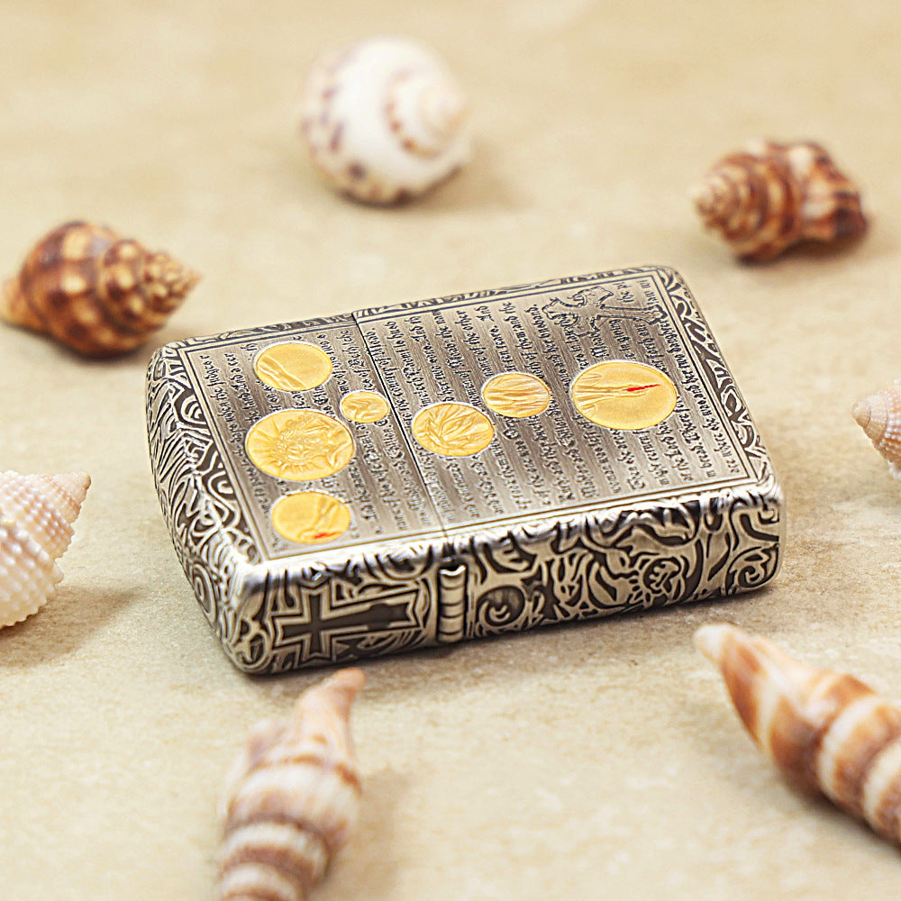 This Zippo lighter features a heavy-walled case with an antique silver finish, characterized by a weathered and non-reflective metallic texture. The face of the lighter is densely engraved with religious text and features several gold-toned circular insets depicting scenes of divine sacrifice and martyrdom. These golden emblems are strategically placed across the body and lid, with some showing subtle red accents to represent blood. The entire case is further embellished with intricate, deep-carved scrolling vines and floral patterns along the edges, while a small cross is engraved in the bottom right corner, completing the gothic spiritual aesthetic inspired by the Constantine series.