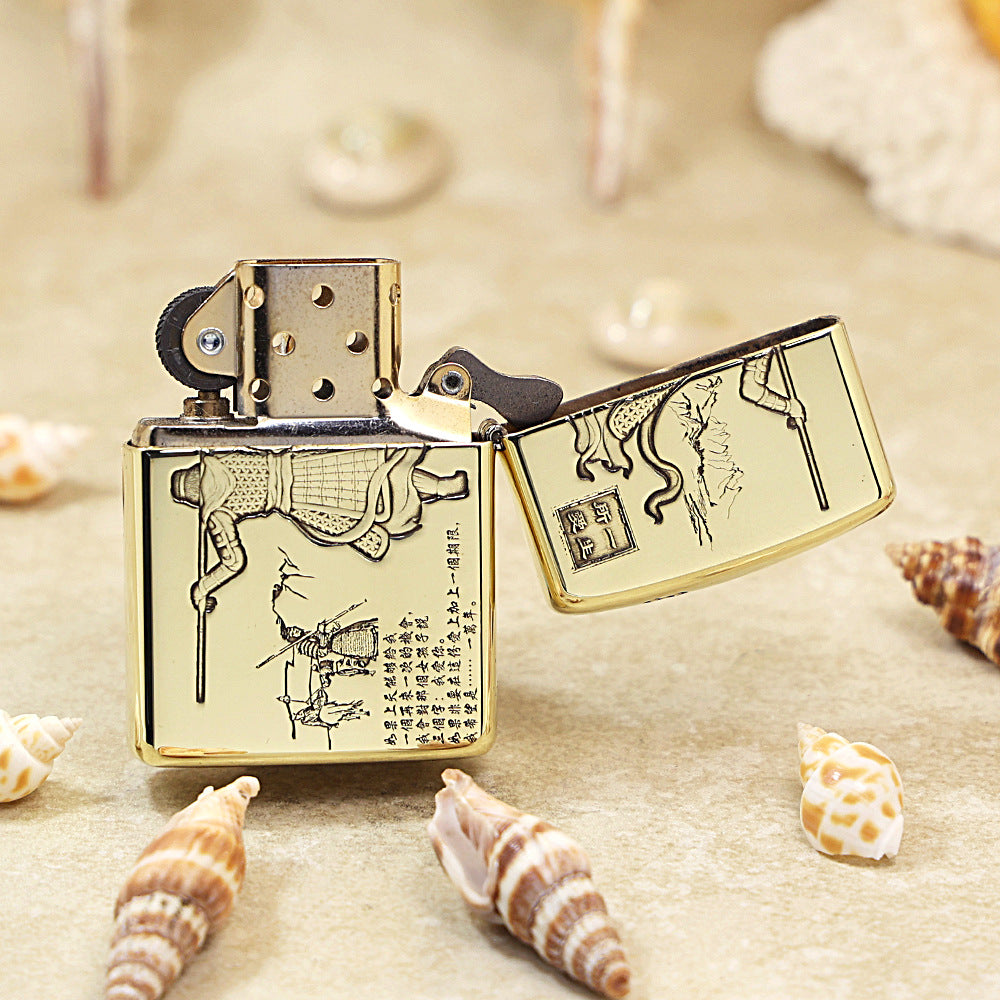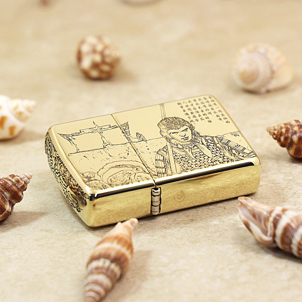 This Zippo lighter is finished in an Antique Brass tone with a rich, rugged texture. The surface features an intense deep relief carving depicting Sun Wukong (The Monkey King) in warrior attire, holding his staff (Ruyi Jingu Bang). The background shows a stylized, detailed landscape, possibly referencing the journey or specific scenes from the classic literature Journey to the West and the film A Chinese Odyssey. This dramatic piece is highly detailed and appeals to fans of Chinese classical mythology and cinema.