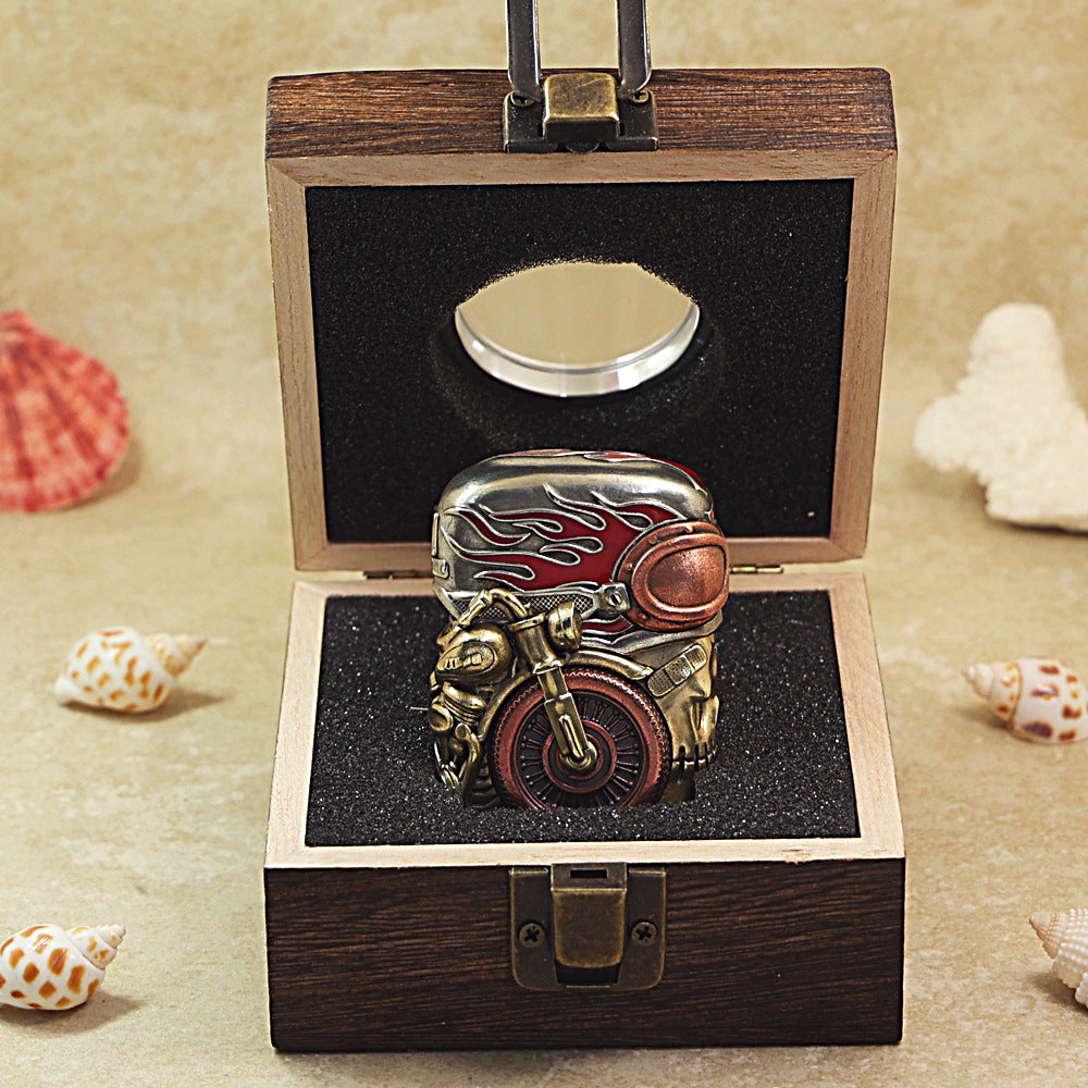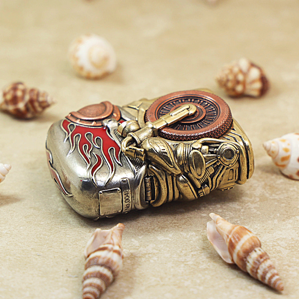 This Zippo lighter features a heavy-duty decorative shell case over a 205 base, showcasing a rugged and rebellious biker aesthetic. The top of the case is designed to resemble a classic motorcycle helmet with brilliant red flame accents and copper-toned goggles resting on the visor. The main body depicts a fearless skeleton character combined with highly detailed mechanical parts of a chopper, including a prominent front wheel with copper spokes, a golden gas tank, and an exposed engine. The antique brass finish is weathered to highlight the intricate three-dimensional relief, creating a bold, industrial look that celebrates the spirit of the open road.