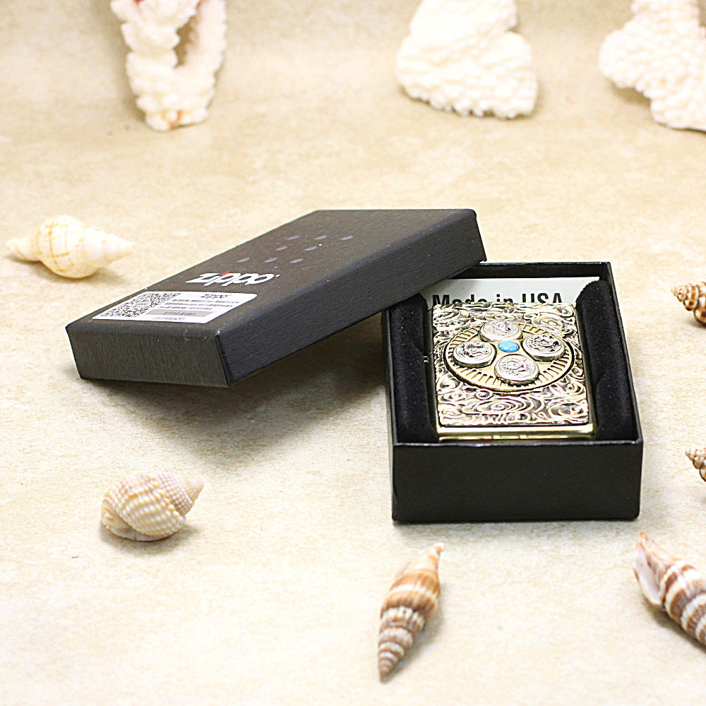 This striking Zippo features a rich Antique Brass finish, giving it a deep, aged bronze look that enhances the highly textured design. The entire surface is covered in an intricate relief pattern of traditional Chinese clouds, symbolizing fortune and good luck. The centerpiece is a bold, circular amulet design, known as a "Lucky Compass." This emblem showcases four smaller medallions, each bearing one of the legendary Four Symbols of Chinese constellations: the Azure Dragon, the Vermilion Bird, the White Tiger, and the Black Tortoise. Completing the design is a small, vibrant turquoise stone at the center of the compass, adding a pop of color and a touch of authenticity. This deeply embossed, premium model is designed for collectors and is sometimes referred to as a "Rotator" due to the design's kinetic appearance.