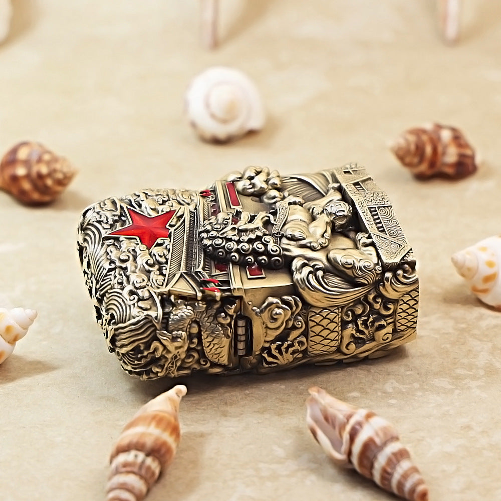 This Zippo lighter features a robust decorative armor shell fitted over a 205 base, finished in a rich antique brass that emphasizes its patriotic and architectural detail. The design showcases a high-relief Imperial Guardian Lion (Shi) standing watch in front of a grand traditional Chinese gatehouse, representing a majestic mountain pass. A large, vibrant red five-pointed star anchors the top right corner against a backdrop of swirling clouds and crashing waves. Small red flags flutter atop the fortress walls, while the lower section features intricate scrolling patterns, symbolizing the strength and endurance of the nation's heritage.