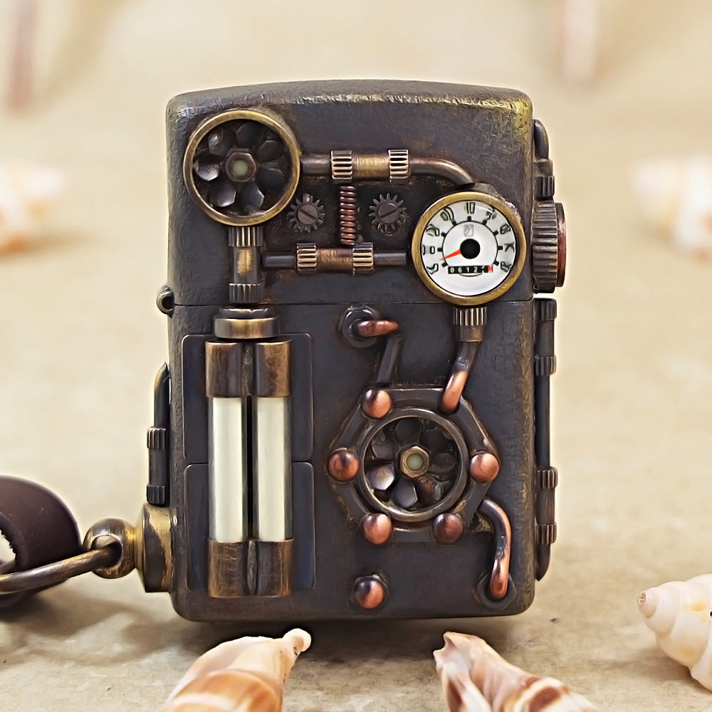 This Zippo lighter features a heavy-walled decorative armor shell fitted over a 204B base, showcasing an intricate Steampunk industrial design. The antique brass-toned shell is covered in complex 3D mechanical details, including copper pipes, exposed gears, and cooling fans. A prominent, realistic white pressure gauge with a red needle is set into the upper right corner, while two vertical glass-like tubes are positioned on the lower left. Many of these mechanical components are treated with a double luminous coating, allowing the gauges and internal "power" cells to glow in the dark. This hand-applied emblem shell transforms the lighter into a piece of retro-futuristic machinery, making it a standout functional art piece.
