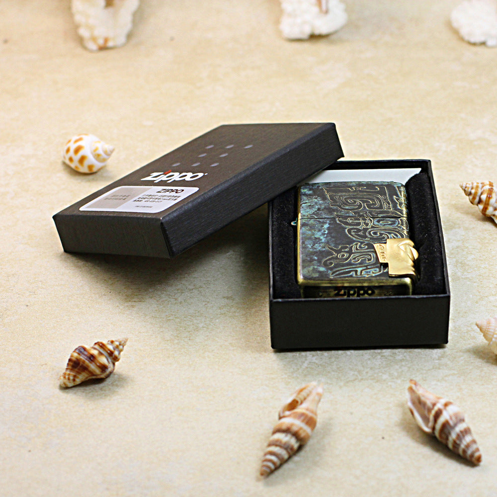 This Zippo lighter features an Antique Bronze finish. The deep-relief engraving on the body is inspired by the bronze totems of the Sanxingdui culture, evoking a mysterious and profound sense of history. The prominent gold human face emblem inlaid on the bottom right corner is particularly striking, creating a strong contrast with the antique bronze base color, showcasing its unique artistic and collectible value. This is not just a windproof lighter, but a beautiful piece of art that fuses ancient civilization with modern craftsmanship.