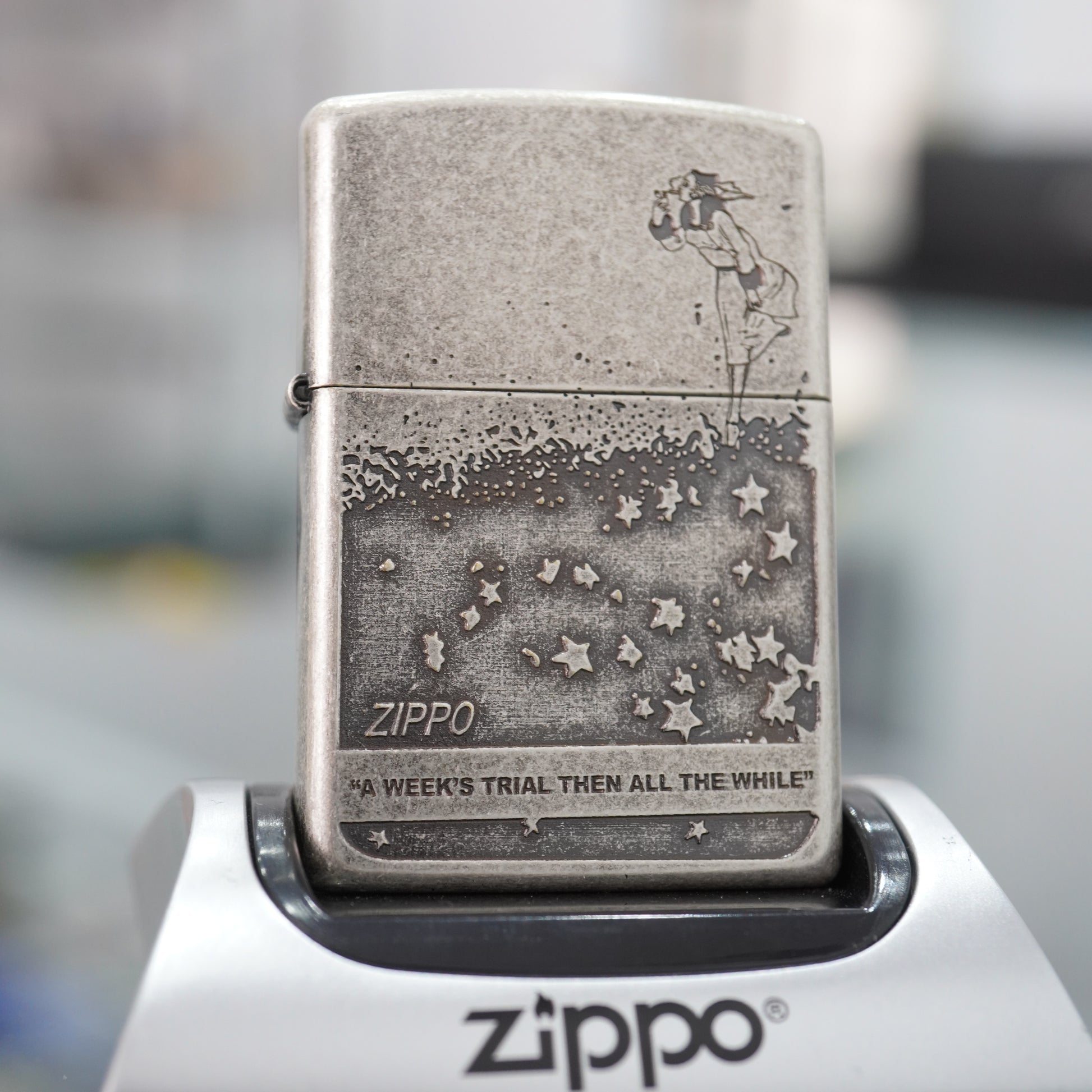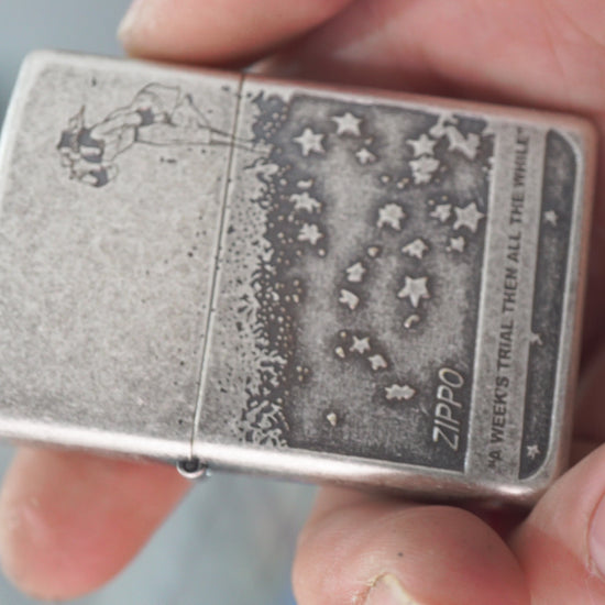 This charming Zippo utilizes the Antique Silver Plate finish (similar to a 'Smoked Chrome' or 'Stone Wash'), giving the lighter a soft, worn-in, vintage appeal. The matte texture hides fingerprints and highlights the deeply etched artwork. The design features a stylized etching of a woman battling the wind, with her hat and scarf flying, creating a stream of stars that cascade down the lighter body. This whimsical image is complemented by the engraved quote, "A Week's Trial Then All The While," adding a touch of romance or introspection. It belongs to the Zippo Character Series and is a distinctive piece for those who appreciate art deco-inspired lines and deep-relief engraving techniques. The robust finish ensures the lighter maintains its unique character over time.