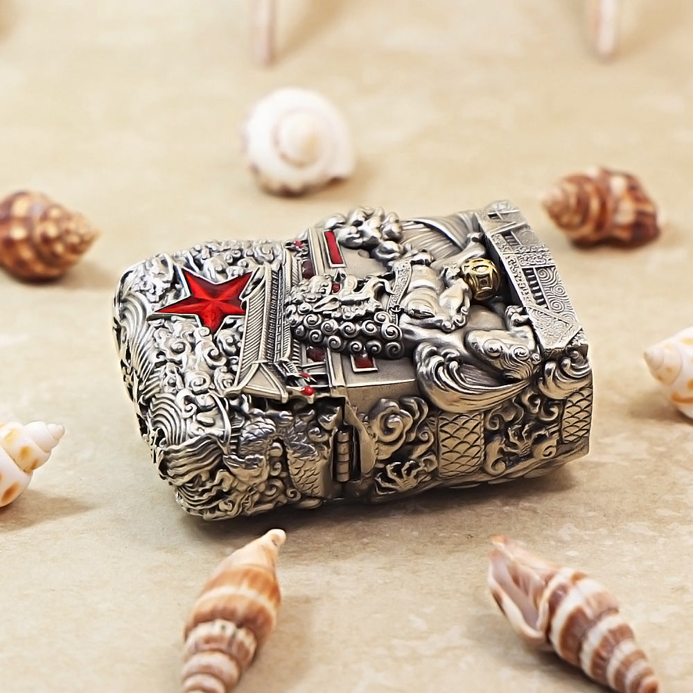 This Zippo lighter features a robust decorative armor shell fitted over a 205 base, finished in a weathered antique silver that emphasizes its patriotic and architectural detail. The design showcases a high-relief Imperial Guardian Lion (Shi) standing watch in front of a grand traditional Chinese gatehouse, representing a majestic mountain pass. A large, vibrant red five-pointed star anchors the top right corner against a backdrop of swirling clouds and crashing waves. The lion rests its paw on a golden-toned ball, providing a sharp color contrast against the silver body. Small red flags flutter atop the fortress walls, while the lower section features intricate scrolling patterns, symbolizing the strength and endurance of the nation's heritage.