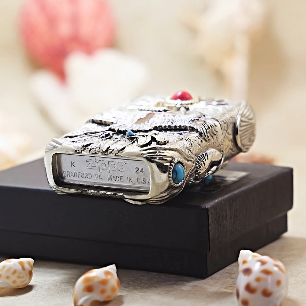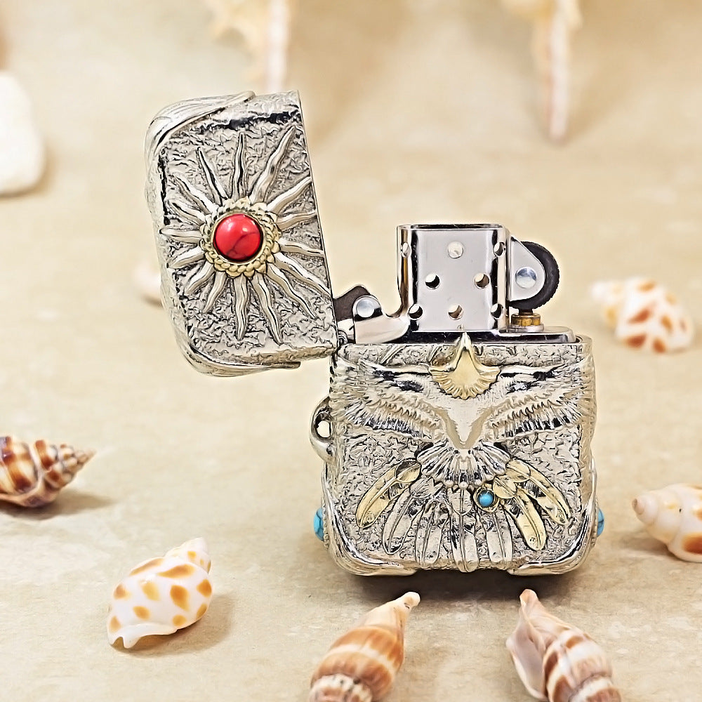 Zippo Antique Silver Shell Blazing Sun Eagle with Red Turquoise Case - CM94