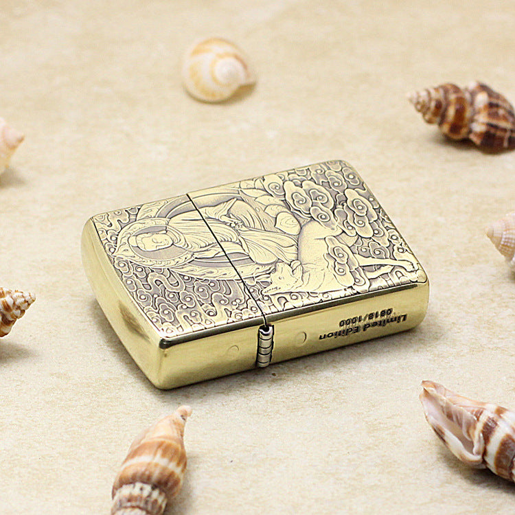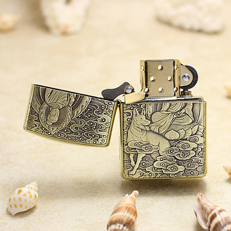 This Zippo is an Armor Case model, renowned for its substantial weight and thick casing, finished in an Antique Brass tone. The entire front surface is dominated by a peaceful, full-body deep relief carving. The detailed artwork depicts Amitābha Buddha (The Guardian Buddha for the Dog Zodiac) seated on a lotus throne, giving a gesture of fearlessness (Abhaya Mudra). Below him is a loyal-looking Dog figure, symbolizing the zodiac animal, surrounded by swirling clouds. This piece is part of the Zodiac Animal Series, highly valued for its intricate craftsmanship and the blend of spiritual and cultural themes.