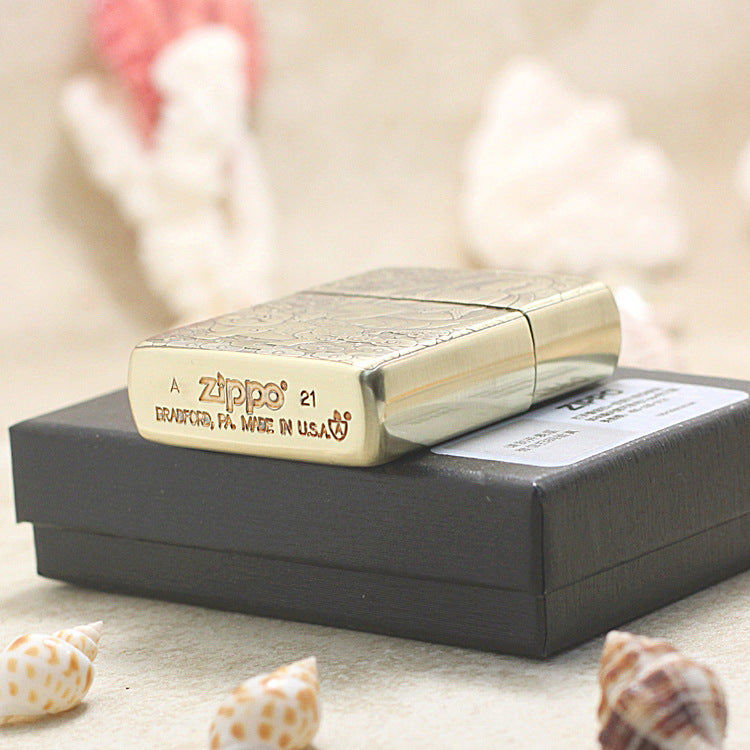 This Zippo is an Armor Case model, featuring a heavy, high-quality casing, and is finished in an Antique Brass tone. The entire front surface is covered by a dense, deep relief carving. The detailed artwork depicts Amitābha Buddha (The Guardian Buddha for the Pig Zodiac) seated on a lotus throne amidst swirling clouds. Below him is a cheerful, stylized Pig figure, symbolizing the zodiac animal. This piece is part of the Zodiac Animal Series, highly valued for its intricate craftsmanship and the serene depiction of spiritual and cultural themes.