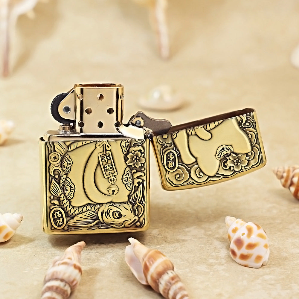 This charming and auspicious Zippo is built on the substantial Armor case, providing extra weight and a dominant presence. It features a rich Antique Brass finish, giving the lighter a deep, aged patina that enhances the intricate, full-surface relief carving. The entire front surface is covered in a deep-carved, three-dimensional scene featuring a smiling Maneki-neko (lucky cat) with its paw raised in a welcoming gesture. The cat is shown resting on a large Koi fish, surrounded by lucky clouds and floral motifs. The design is enhanced with traditional Japanese symbols of fortune, including a Daruma doll and miniature coins and charms. This highly detailed piece is a significant collectible, symbolizing good fortune, wealth, and success.