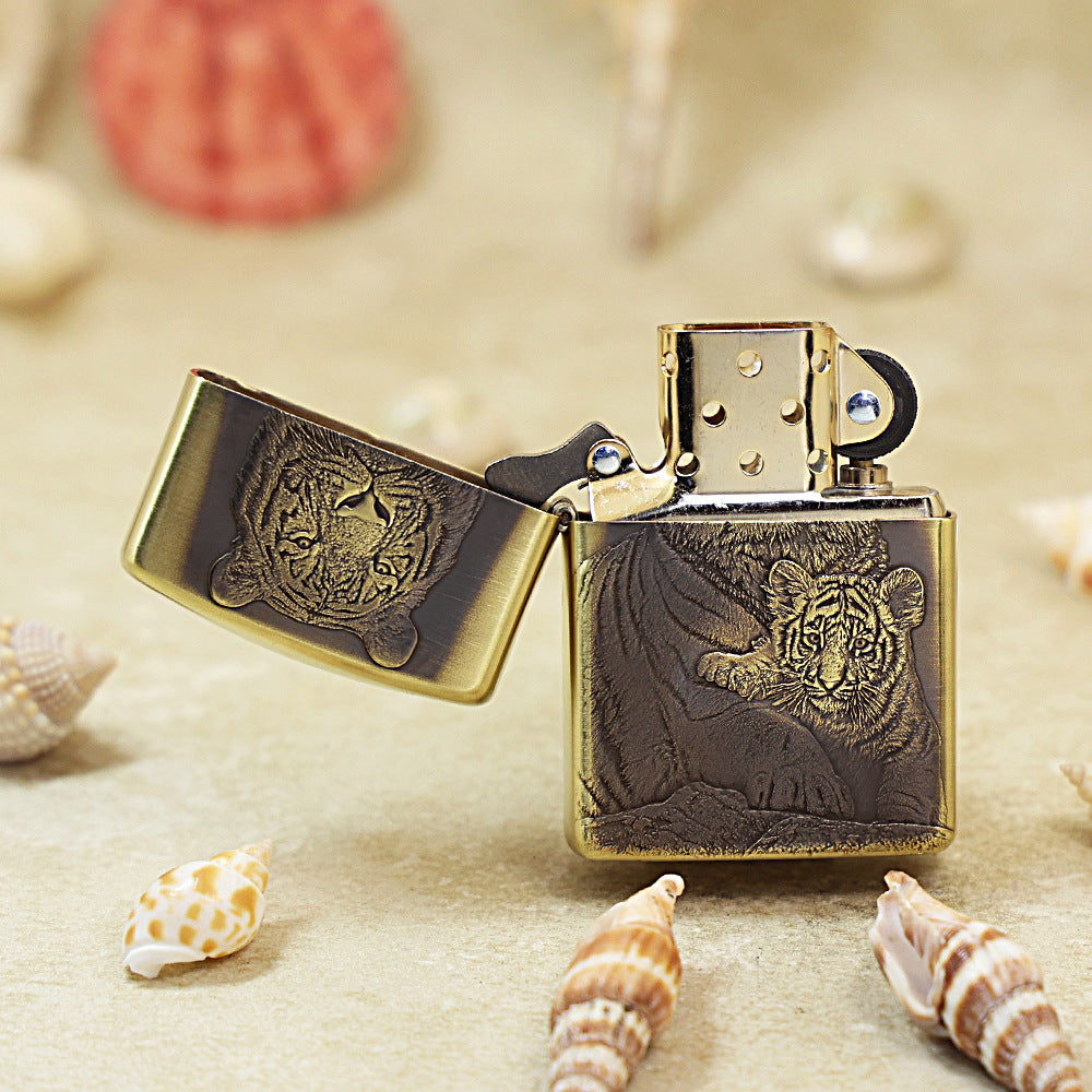 This striking Zippo is built on the substantial Armor case, providing extra weight and a dominant presence. It features a dark, Antique Brass finish that gives the piece an ancient, powerful texture. The design is a deep-carved, highly emotive depiction of two tigers. The larger, powerful adult tiger dominates the background, with its massive head and shoulders forming the core of the relief. A smaller, adorable tiger cub rests securely on its parent's back, facing forward. The carving is incredibly detailed, showing the texture of their fur and the depth of their powerful build. The image conveys a strong sense of protection and fierce, natural beauty. This piece is a magnificent collectible dedicated to the power of the zodiac animal.