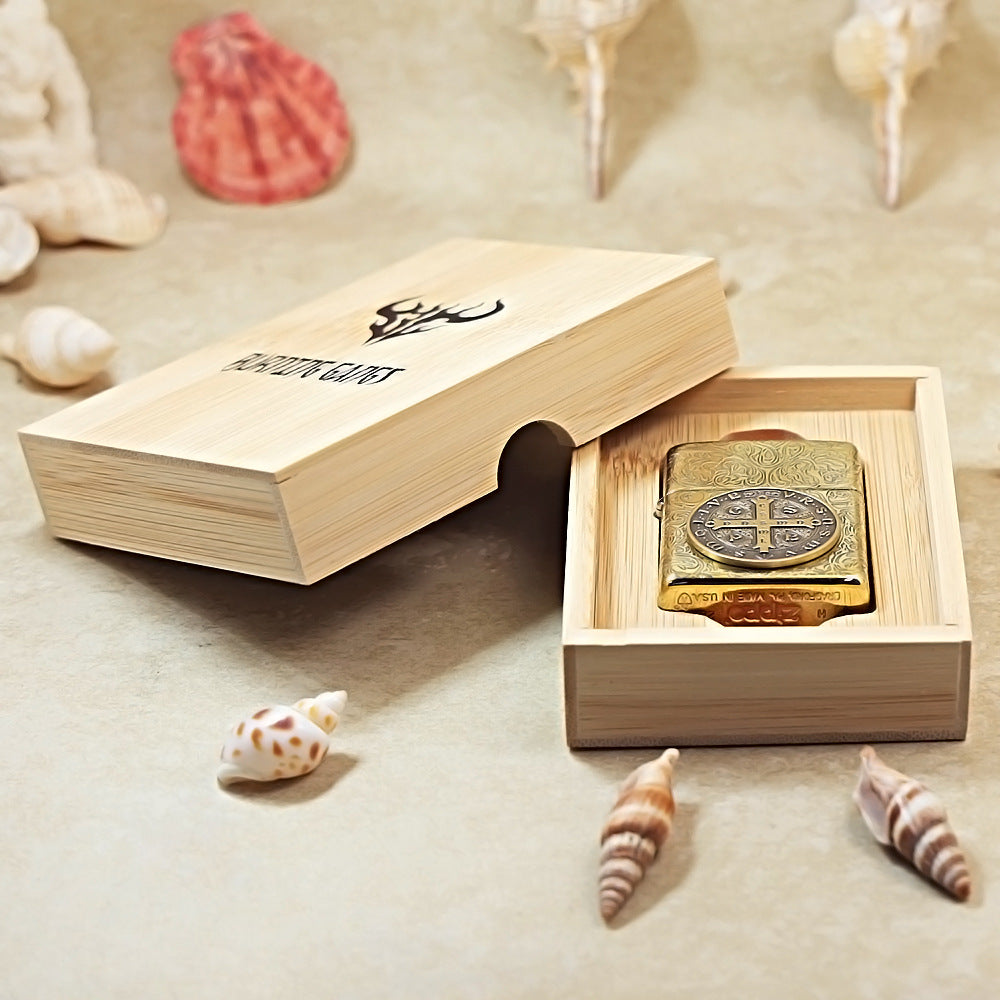 This striking, heavy-duty Zippo is built on the substantial Armor® case and features a deep Antique Brass finish, giving it a rich, vintage gold appearance. The entire surface is covered in an elaborate, deep-carved knotwork or vine motif, creating a tactile and intricate backdrop. The centerpiece is a large, highly detailed emblem of the Saint Benedict Medal, famously associated with protection and exorcism in Christian tradition. The medal features the cross and various Latin inscriptions, including the Benedictine motto VRSNSMV SMQLIVB and the initial letters of the phrase Crux Sacra Sit Mihi Lux (May the Holy Cross be my light). This highly textured and collectible piece is often sought after by fans of the occult, religious iconography, and the movie Constantine, where a similar Zippo lighter is featured. The deep-carving ensures this Zippo is as durable as it is visually impressive.