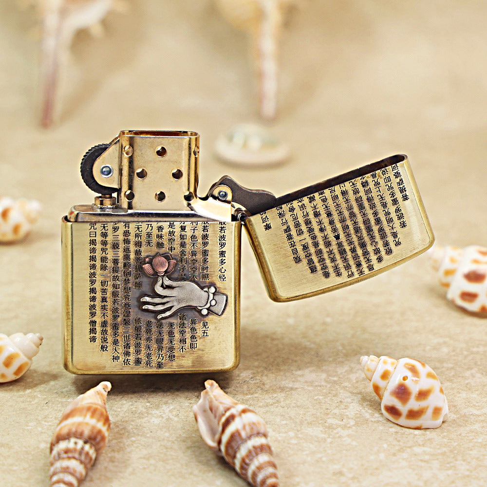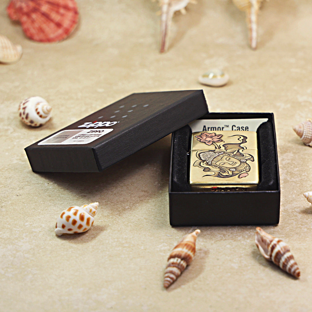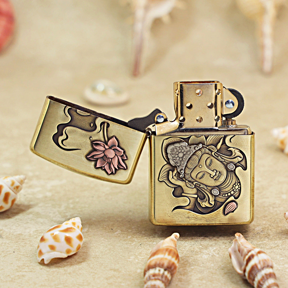 This serene Zippo is built on the substantial Armor case, providing extra weight and a dominant presence. It features a deep Antique Brass finish, giving the lighter a rich, dark patina that beautifully enhances the spiritual subject matter. The central design is a full-surface, deep-carved relief of a Bodhisattva (ph?t B? tát), depicted in a tranquil, reclining pose. The figure is elaborately adorned with traditional headdresses and necklaces, with a calm expression symbolizing inner peace. A single, contrasting rose-gold lotus flower blooms directly above the Bodhisattva's head, connected by a stylized plume of smoke or flowing energy. The carving is detailed with silver accents on the headdress. This profound piece is a highly tactile collectible dedicated to Buddhist art and meditation.