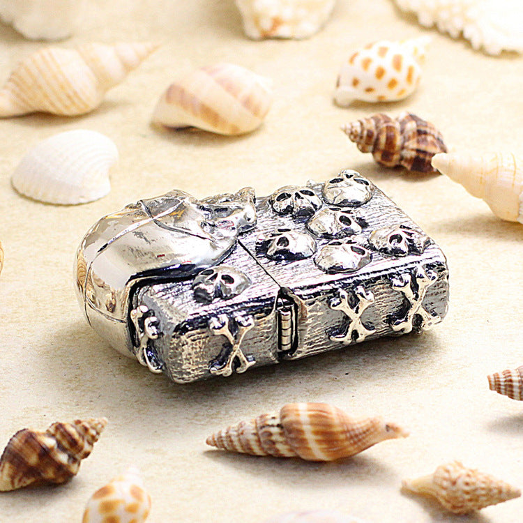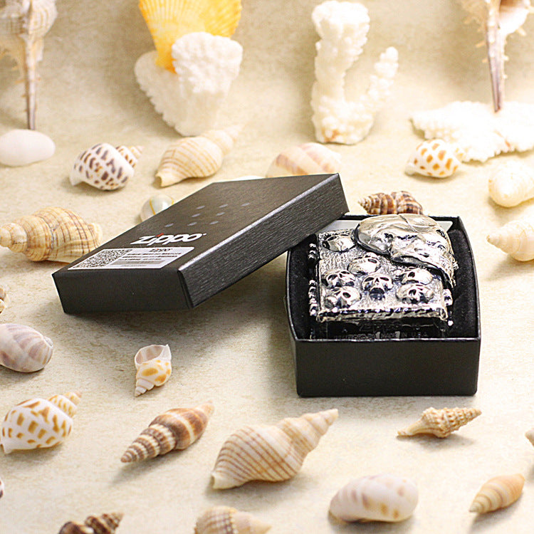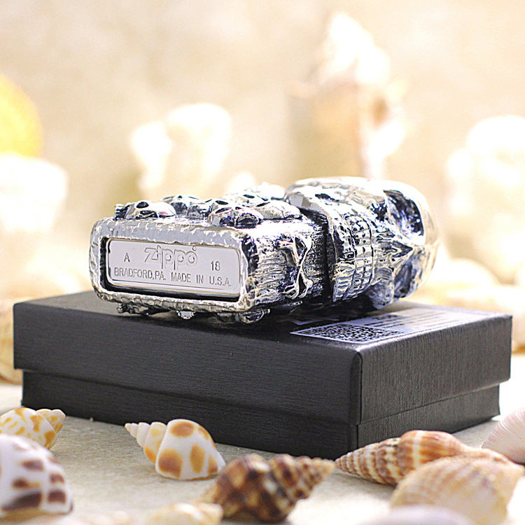 This aggressively styled Zippo features the premium Armor® case, which is significantly thicker and heavier than a standard Zippo, enhancing its substantial, powerful feel. The entire lighter, including the lid and all sides, is adorned with a detailed, high-relief multi-skull design, given a rugged, aged appearance by the Antique Silver finish and deep texture carving. A prominent, polished oversized skull emblem is dramatically affixed to the upper right section, contrasting with the rough texture of the background skulls. This highly detailed and durable piece is a must-have for collectors who favor bold, gothic, or heavy-metal aesthetics, and it is guaranteed to be a genuine Zippo windproof lighter.