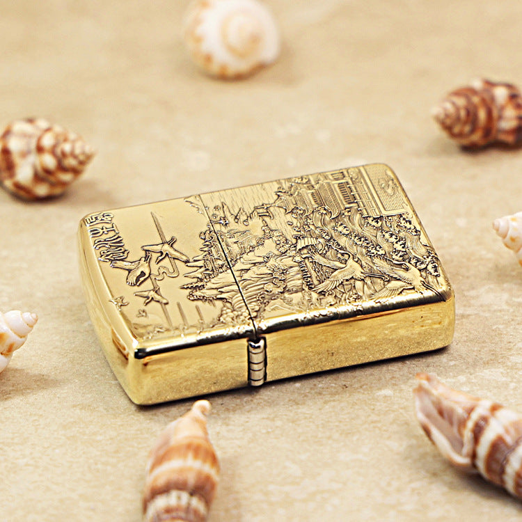 This majestic Zippo is built on the substantial Armor case, providing extra weight and a dominant presence. It features a bright High Polish Brass finish, serving as a gleaming golden canvas for the deep-carved, full-surface relief. The design is a stunning, three-dimensional panoramic landscape inspired by Asian fine art. It depicts towering mountains, a majestic waterfall, a tranquil lake, and detailed traditional pagodas and pavilions. A group of stylized Cranes is carved prominently, with two large cranes flying over the water in the foreground and a flock flying near the full moon at the top. The top right corner includes an engraved phrase that signifies Ascending Fortune, reinforcing the theme of prosperity and success. This exceptional piece is a visually rich collectible celebrating harmony and auspicious symbolism.