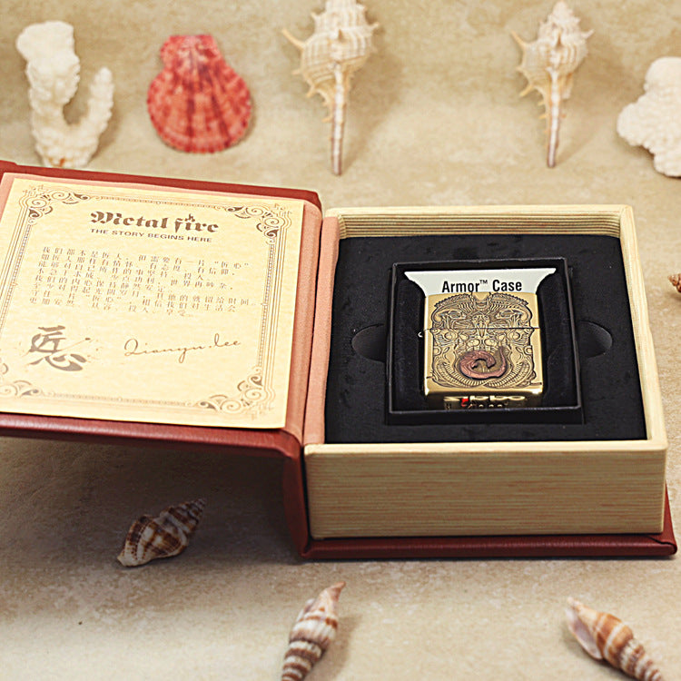 This striking Zippo is built on the substantial Armor case, providing extra weight and a dominant presence. It features a bright High Polish Brass finish, serving as a gleaming golden canvas for the deep-carved, full-surface relief. The central design is a terrifying, highly detailed biomechanical entity clearly inspired by the Alien film franchise. The creature's elongated head, skeletal ribcage, and intricate internal structures are all carved in deep relief across the front. The heart of the design features the Chestburster stage of the creature, which is plated in a contrasting deep red and rose-gold color accent, emphasizing its visceral nature. The side of the case is vertically engraved with the word ALIEN. This exceptional piece is a visually complex collectible dedicated to science fiction and horror art.
