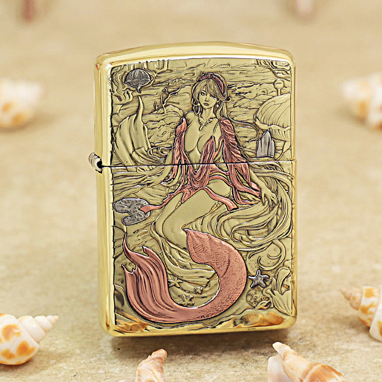 This captivating Zippo is built on the substantial Armor case, providing extra weight and a dominant presence. It features a bright High Polish Brass finish, serving as a clean golden canvas for the deep-carved, full-surface relief. The central design features a seductive mermaid posed gracefully amidst a stylized underwater landscape of seaweed, coral, and shells. Her upper body is shown prominently, and her long hair flows dynamically around her. The carving is enhanced by multi-tone plating: the mermaid's tail and the flowing fabric around her are plated in a contrasting rose-gold accent, and her long hair is given subtle texture and shading. This intricate piece is a visually striking collectible dedicated to mythological sea creatures and fantasy art.