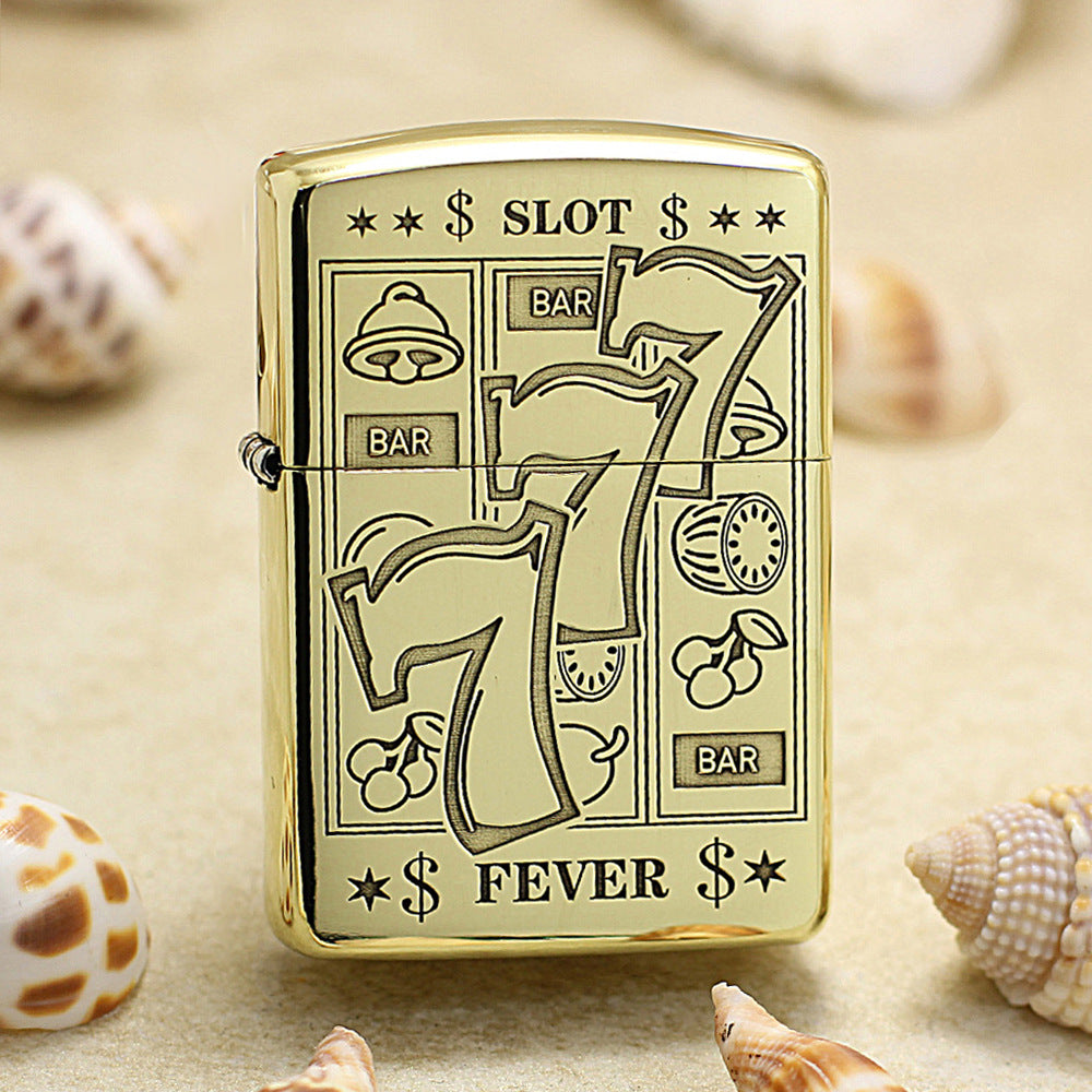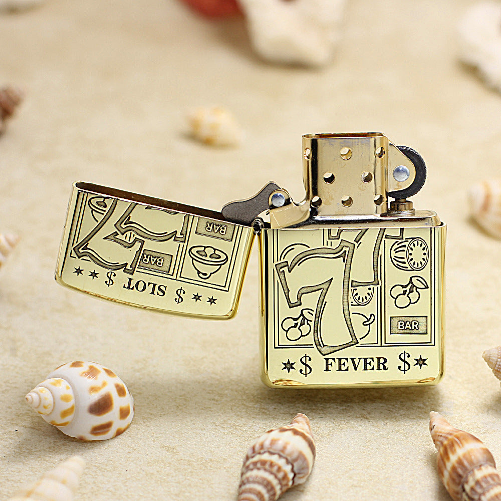 This striking Zippo is built on the substantial Armor® case, providing a heavy, durable feel. It features a brilliant High Polish Brass finish, serving as a bright, luxurious golden backdrop for the deep-carved gambling theme. The entire front surface is covered in a highly stylized, deep-carved design mimicking a classic slot machine screen. The centerpiece features three massive "7" symbols, representing a jackpot win, overlaid on a background of cherries, bells, and "BAR" symbols. The design is framed by the text "$ SLOT $ FEVER $", emphasizing the excitement of casino entertainment. This highly tactile piece is a unique collectible for those who enjoy gaming themes and the dramatic look of deep relief carving on polished brass.