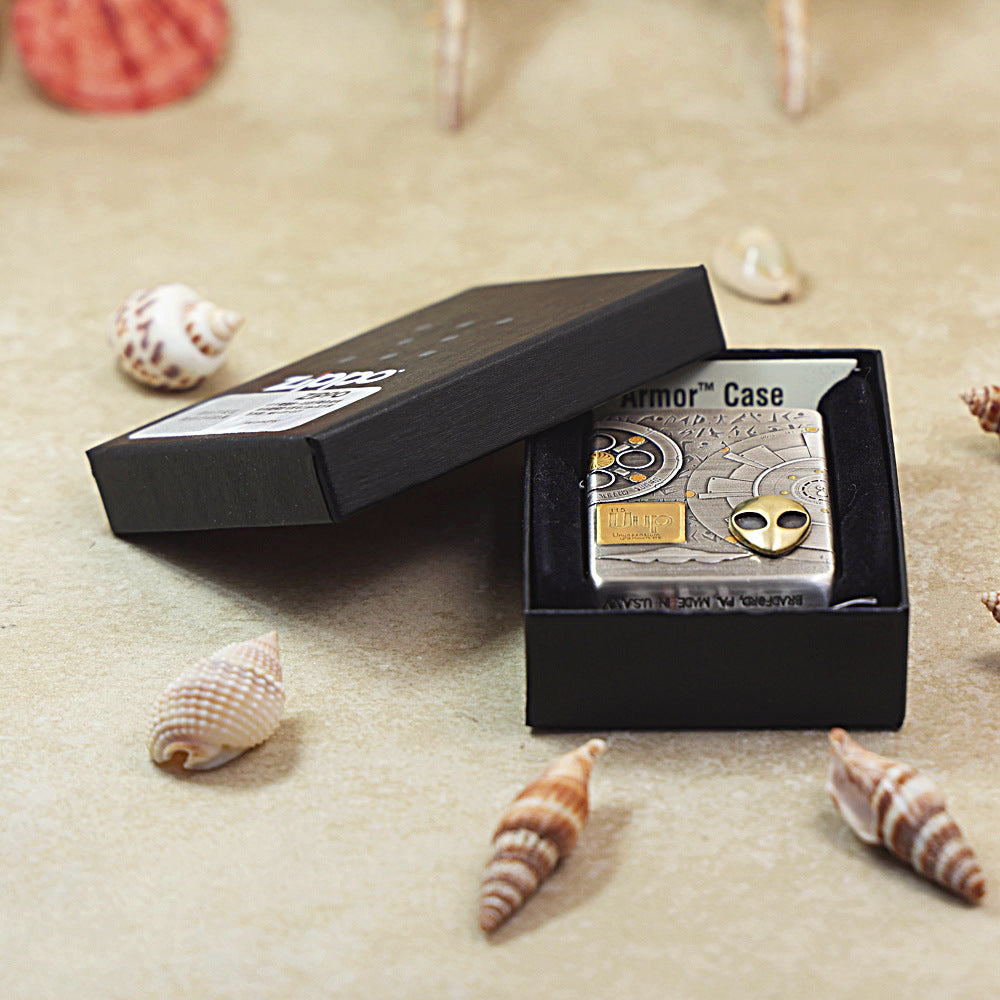 This heavy-duty Zippo lighter is constructed on the substantial 162 Armor Case, featuring a heavily textured Smoked Chrome finish that provides an industrial, antique silver look. The design, custom-made by the Thousand Language Studio (?????), features a deep-carved, high-relief sci-fi/UFO theme across the entire surface, including alien symbols, mechanical elements, and a stylized golden square representing the element Ununpentium (Uup), often associated with advanced alien technology. The highlight is a prominent, gold-plated alien head emblem affixed to the lower right. This piece is a must-have for sci-fi enthusiasts and collectors of unique, custom-finished Zippo models.
