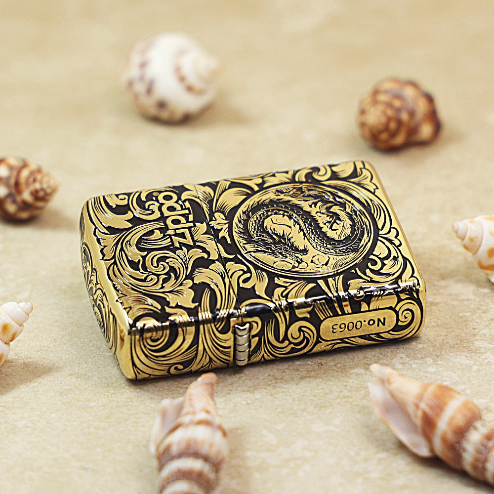 This highly luxurious Zippo lighter is built on the sturdy Zippo case and features a striking black and gold color scheme. The entire surface is covered in an intricate, deep-carved design, with the golden metal contrasting sharply against the dark, black-filled background. The design is dominated by elaborate, Baroque-style scrollwork that covers the top and bottom of the case. Centered on the lighter is a prominent circular medallion featuring a powerful, coiled Asian Dragon, further solidifying its place in the Zippo Zodiac Animal Series. This piece is perfect for collectors who appreciate highly decorative, deep-carved lighters with dramatic color contrast. The deep engraving and the rich gold plating create an accessory that is both visually stunning and highly tactile.
