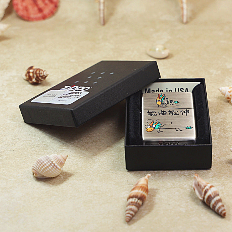 This unique Zippo lighter is set on a classic case with a Brushed Smoked Chrome (205) finish, providing a durable, textured silver appearance. The design features a humorous, colorful graphic with two stylized, cartoon-like dragon figures—one coiled up and one stretched out—flanking the central Chinese phrase "????" (néng qu néng shen). This idiom, translating to "Can Bend and Can Stretch," signifies flexibility, adaptability, and the ability to both yield and assert oneself, symbolizing wisdom and resilience. This piece offers a witty and culturally significant take on the dragon motif, making it an interesting collectible.