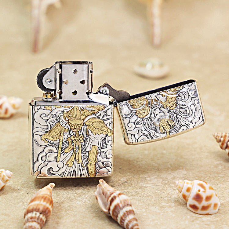 This Zippo lighter features a stunning dual-tone engraving of Erlang Shen — the legendary Chinese deity known for his third eye of truth and his loyal celestial hound. The intricate design combines silver and gold tones to highlight the dynamic motion of the warrior and the powerful stance of his companion. Crafted with exceptional detail, this piece belongs to Zippo’s Mythical Heroes Series, celebrating divine strength, justice, and courage.