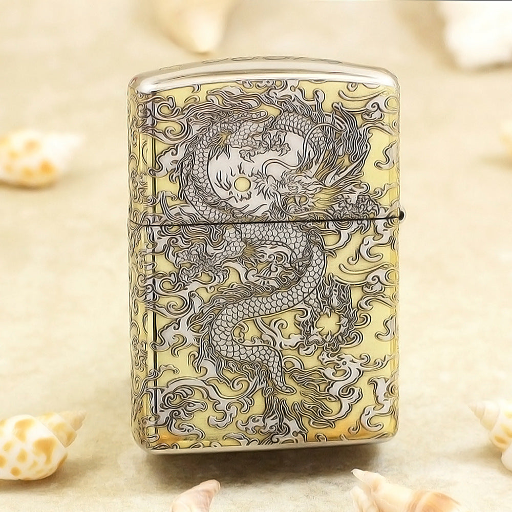 This Zippo lighter features a decorative Two-Tone finish with a gold base and a highly detailed silver carving. The entire front surface is covered by an exceptionally intricate Deep Relief Carving of a mythical Dragon. The powerful creature is depicted coiling and rising amidst stylized Swirling Clouds, embodying the theme of a dragon flying high in the sky. The contrasting colors and dense carving create a dynamic and ornate aesthetic. This piece belongs to the Zodiac/Animal Series.