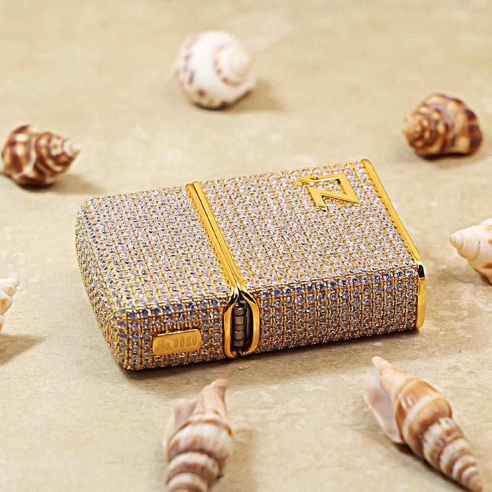 This Zippo lighter features a standard base fitted with a luxurious gold-toned decorative shell case. The entire surface of the body and lid is meticulously covered in a dense pavé setting of brilliant white crystals, creating a dazzling full-coverage aesthetic. On the lower right corner of the body, a polished gold "Zi" logo is applied as a distinctive focal point against the shimmering crystal background. This high-end accessory combines the classic warmth of a gold finish with the intense brilliance of hand-set stones, making it a premier collector's piece in the luxury logo series.