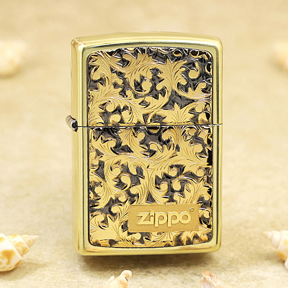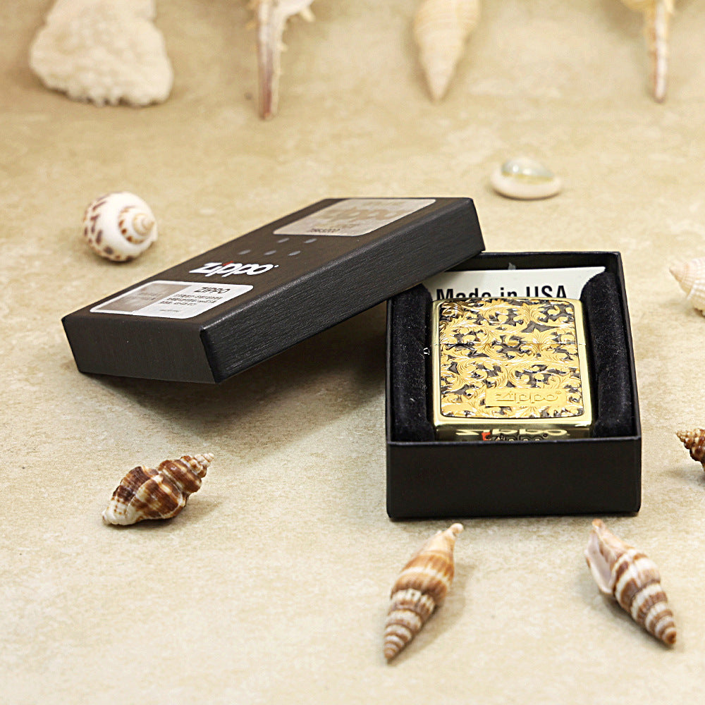 This opulent Zippo features a striking High Polish Gold Plate finish on its outer frame, providing a luxurious contrast to the deeply carved central panel. The entire front surface is covered in an intricate, continuous Arabesque or Floral Scroll pattern, where the raised gold motifs contrast sharply with the dark, antique-finish recesses. This deep-carving technique gives the lighter an exceptional tactile feel and visual depth. The design also incorporates a subtle Zippo logo panel near the bottom. As a rich and elegant piece from the Floral/Plant Series, this Zippo is a stunning accessory for those who appreciate ornate, classic craftsmanship, and it is guaranteed to be a genuine windproof lighter.