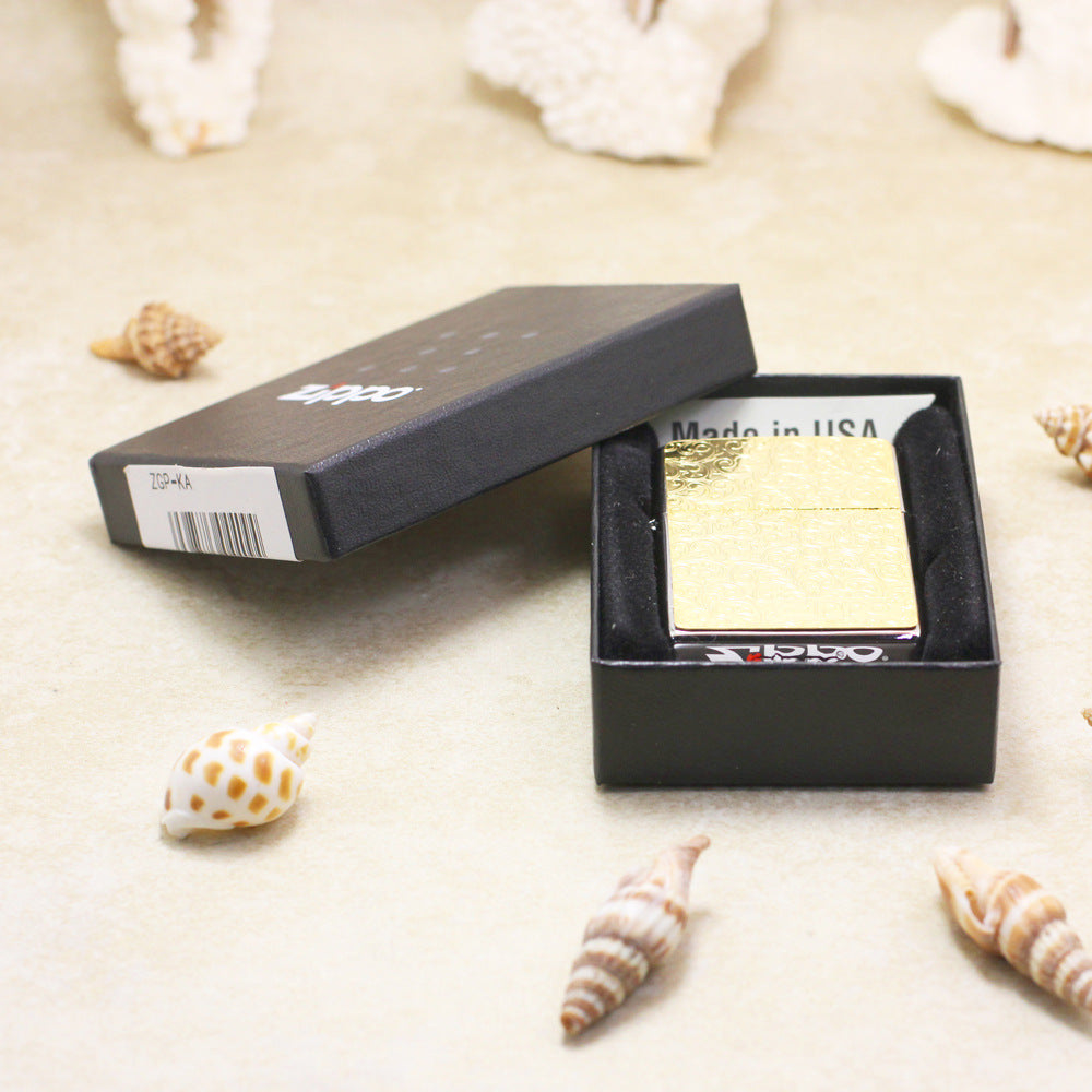This luxurious Zippo features a striking High Polish Chrome finish on the case, beautifully framing the central artwork. The entire front surface is covered by a highly detailed Gold Plate emblem featuring an elaborate, deep-carved Floral Arabesque (Tang Cao) pattern. This opulent pattern gives the lighter a rich, textured feel and extends the full length of the front, creating a stunning contrast against the polished chrome edge. As an elegant and ornate piece from the Floral/Plant Series, this Zippo is a sophisticated accessory, backed by Zippo's renowned windproof reliability and lifetime guarantee.