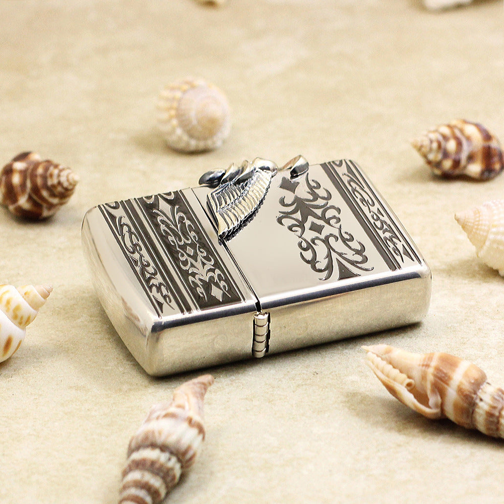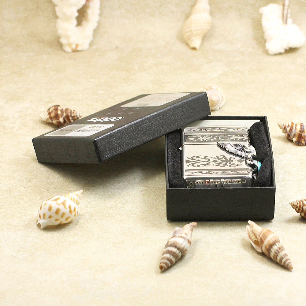 A bold and striking design featuring a 3D sculpted eagle wing on the side, adorned with a vivid turquoise stone. The lighter’s engraved tribal patterns add a sense of mystique and strength, while the high-polish silver finish enhances its premium look. This model embodies freedom and power — a true statement piece for collectors who appreciate craftsmanship and attitude.