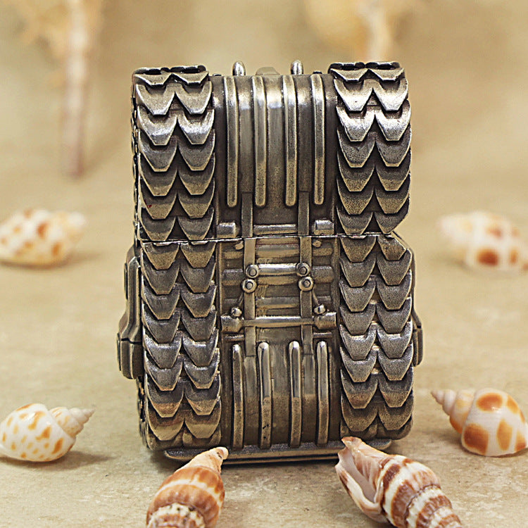 This Zippo is a rugged, decorative Heavy Relief Case Set. The case is sculpted entirely to resemble a powerful Armored Tank or futuristic war vehicle. The design is characterized by massive, textured Treads on the sides and a central brass-toned turret with visible Machine Guns. The overall finish is a mixture of antique silver and brass, giving it a weathered, battle-ready appearance. A prominent Z-symbol is visible on the top rear of the body. This piece belongs to the War/Military Theme Series.