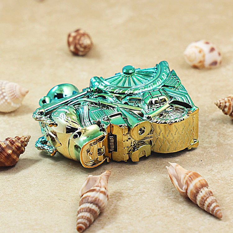 This Zippo is a striking, decorative Heavy Relief Case Set. The case is sculpted entirely to resemble a powerful Motorcycle, focusing on the engine, wheels, and front cowl. The finish is a unique, high-polish Iridescent/Gradient Chrome that shows shifting hues of Blue, Teal, and Gold. The design features extensive, mechanical details on the engine block and spokes of the wheel. This highly detailed piece belongs to the Motorcycle/Vehicle Series.