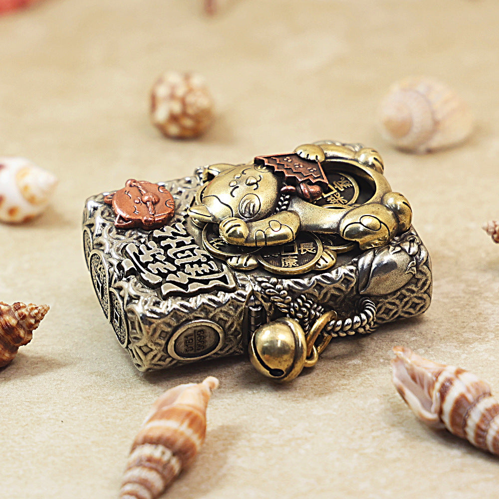 This Zippo lighter features an extremely elaborate, three-dimensional Heavy Relief Case Set with a multi-toned finish. The main body is covered in a textured, silver pattern, with a large, highly detailed Golden Lucky Cat (Maneki-Neko) figure mounted in the center. The cat holds a red, tiled tablet and has a raised paw, symbolizing good fortune. Above the cat are large, carved Chinese characters for Bringing in Wealth and Treasure (????). The lighter also has a small, secondary Copper Cat Charm and a chain detail on the side. This ornate piece belongs to the Fortune/Animal Series.