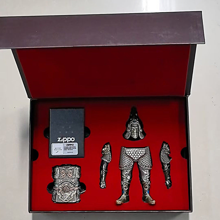 This Zippo is presented as a decorative Heavy Relief Case Set. The entire lighter is encased in a three-dimensional shell shaped like the intricately detailed Armor and Robes of a powerful Chinese general. The armor is finished in rich, multi-colored Enamel and Metal Tones, including silver, gold, red, and blue. Prominent decorative motifs include Dragon figures on the chest and a fierce Lion Head buckle on the waist. This piece belongs to the Warrior/Mythology Series.