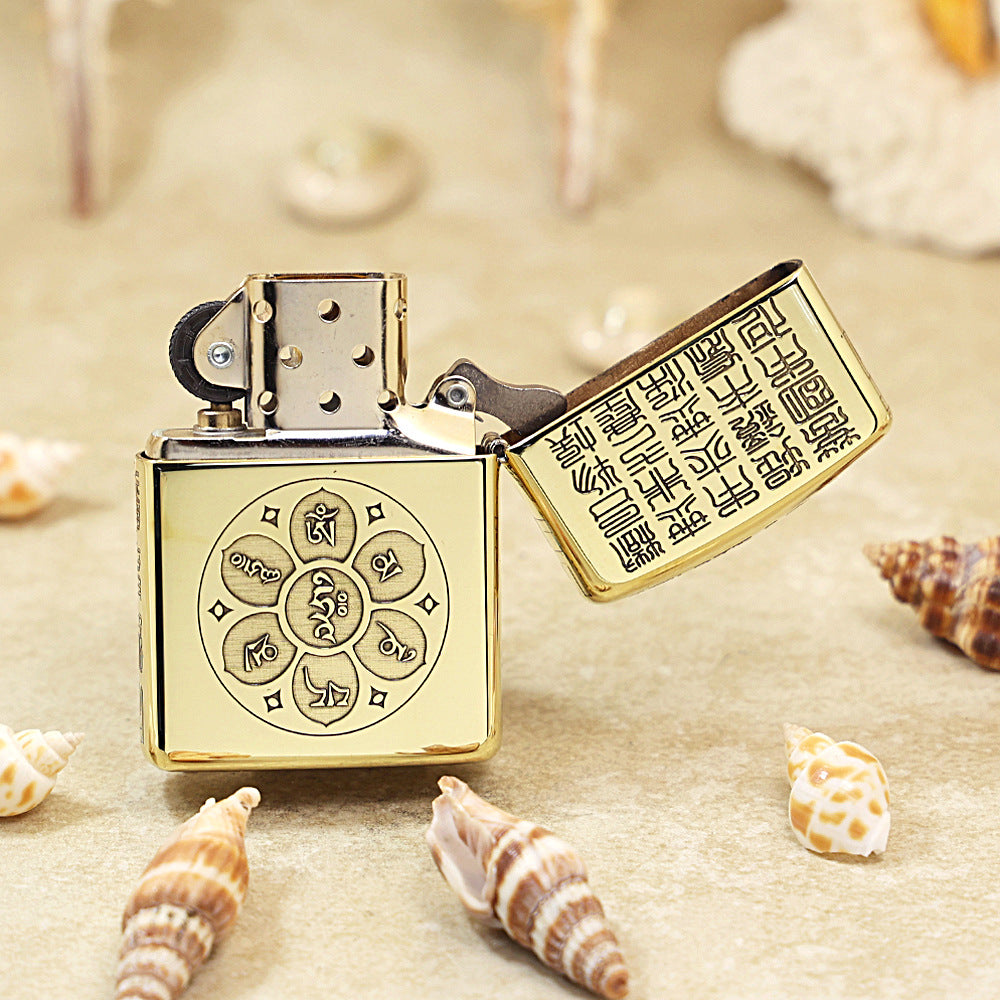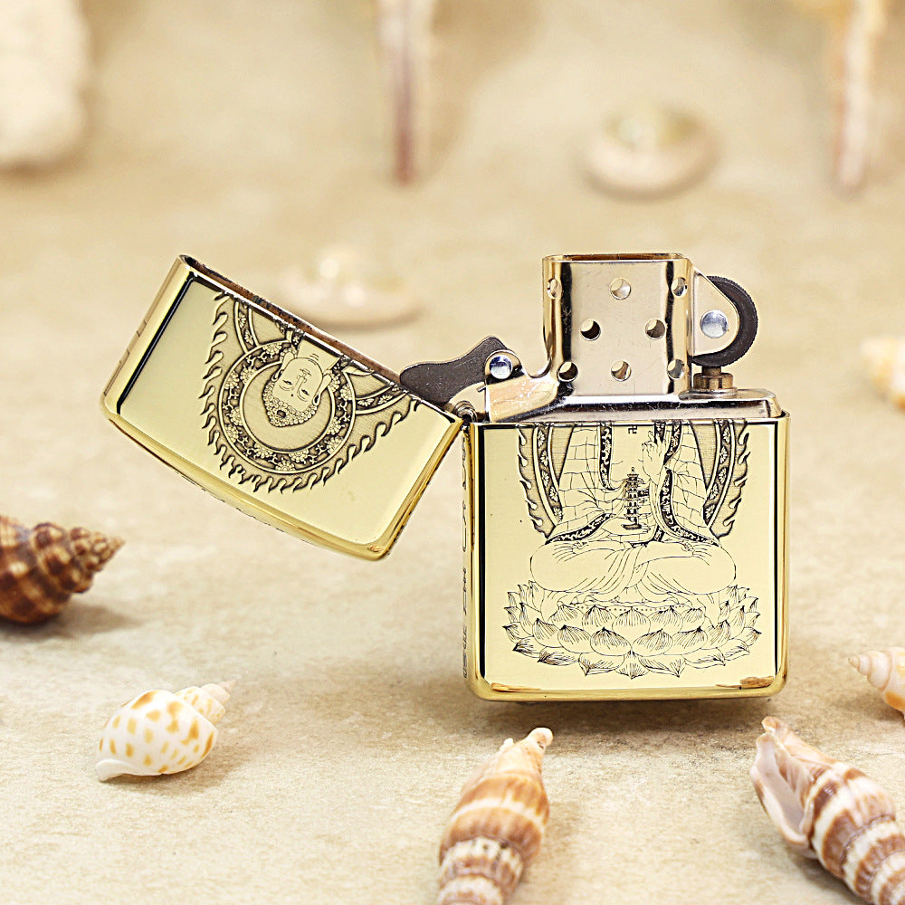 This Zippo lighter is finished in a bright High Polish Brass tone. The surface is covered with a highly detailed deep engraving of a seated Buddha figure (Tathagata), posed in the Abhaya Mudra (gesture of fearlessness), holding a small stupa/pagoda on his hand. The figure sits upon a detailed lotus flower throne, backed by a flaming mandorla (halo of fire), a common feature in Buddhist art. This intricate piece is part of the Spiritual/Character Series, appealing to collectors who appreciate detailed devotional and mythological designs.