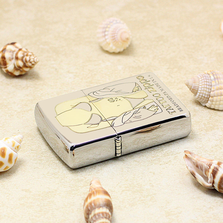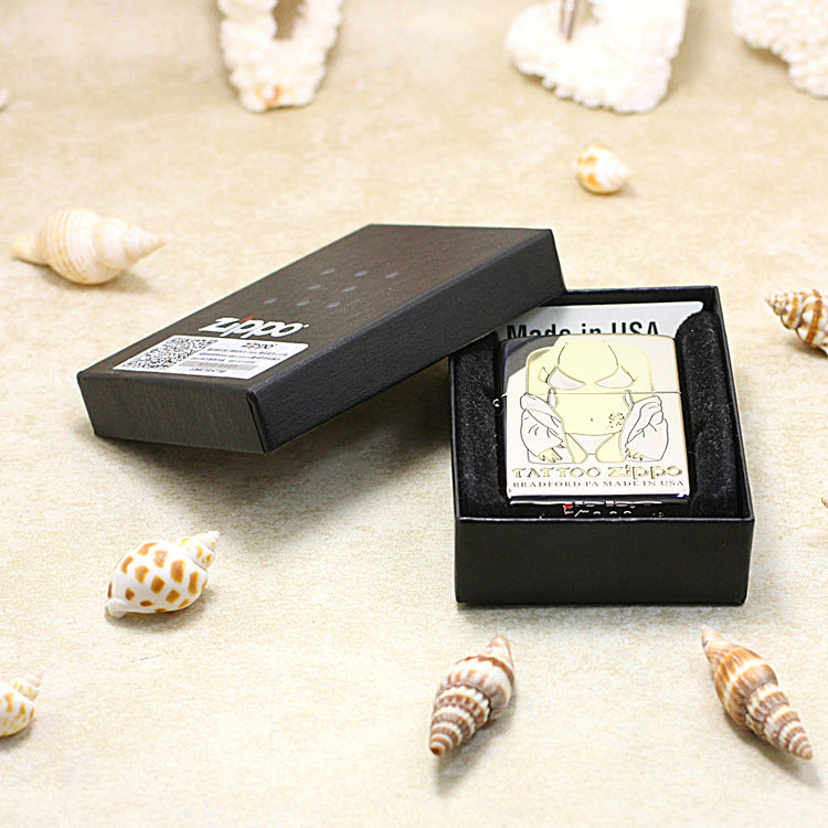This Zippo lighter features a bright High Polish Chrome finish. The main design is a striking Deep Engraving that outlines a partially clothed female figure, featuring a bikini and an open coat, with the recessed area finished in a gold tone. A small rose tattoo is visible on the abdomen. The bottom is engraved with the text TATTOO ZIPPO. This minimalist yet bold piece belongs to the Pin-Up/Female Character Series.