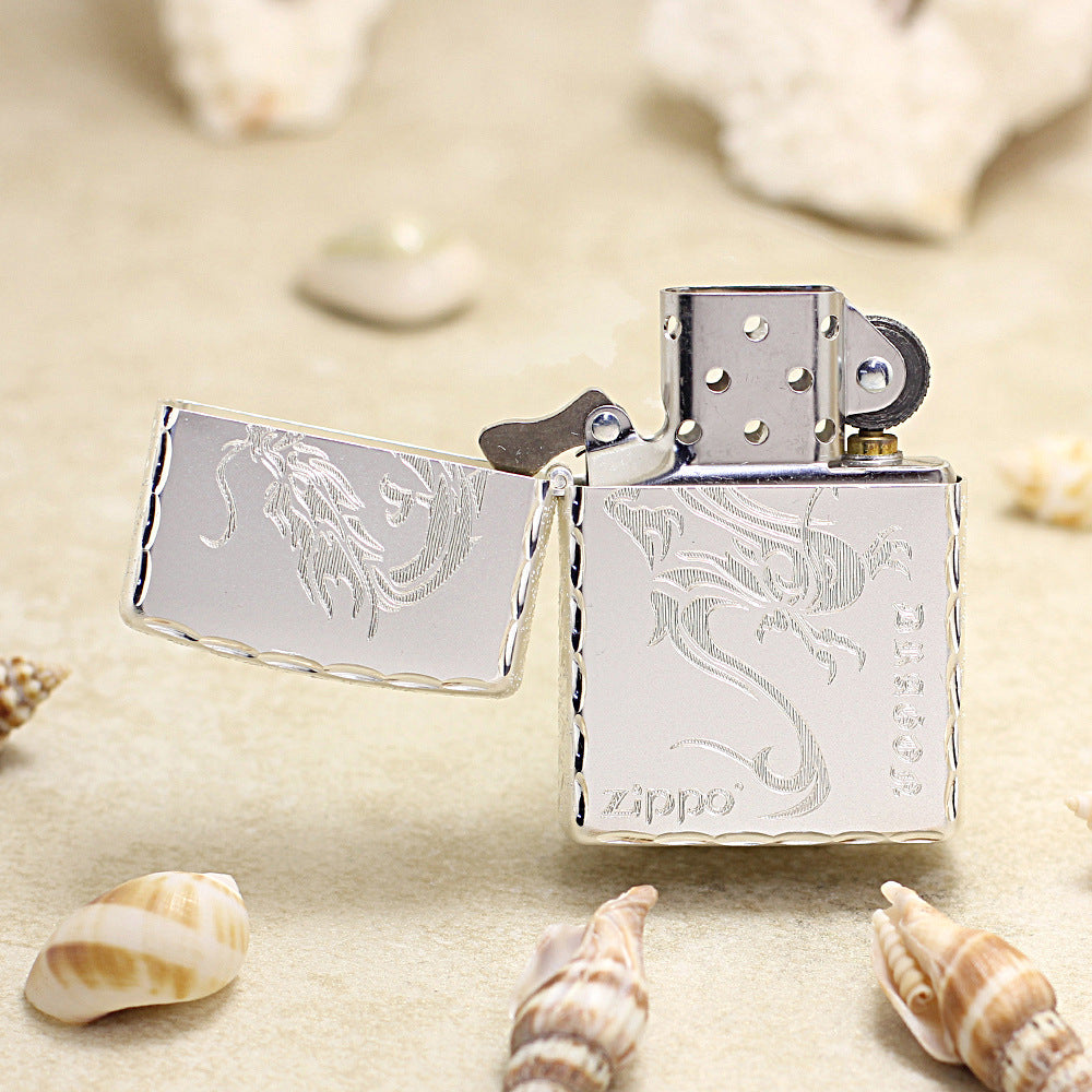 This highly collectible Zippo lighter features a lustrous High Polish Chrome finish, giving it a bright, mirror-like appearance. The sides are adorned with a unique deep-cut border pattern, enhancing its distinguished look. The front surface showcases an exquisitely detailed, hand-engraved image of a powerful Chinese Dragon. This intricate carving captures the mythical creature in flight, symbolizing power, good fortune, and majesty. Part of the Zippo Zodiac Animal Series, this lighter is a special edition celebrating the Year of the Dragon. The deep-engraved design ensures durability and tactile appeal, making it a perfect gift or a distinguished addition to any collection.