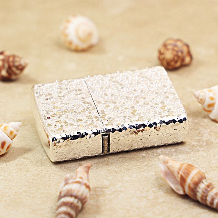 This Zippo lighter features a bright, high-polish Chrome Finish that is completely covered in a dense, irregular Heavy Texture. This unique texturing resembles a surface of smashed glass, Shattered Ice, or the pitted surface of a Meteorite Crater. The highly reflective, non-uniform surface gives the lighter a distinct, tactile feel.