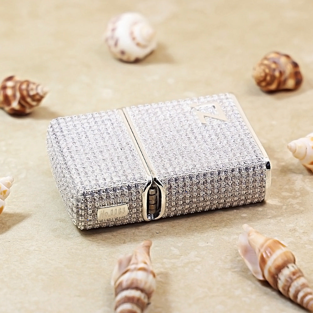 This Zippo lighter features a standard base fitted with a brilliant silver-toned decorative shell case. The entire surface of the body and lid is meticulously covered in a dense pavé setting of shimmering white crystals, creating a continuous "full diamond" sparkle. On the lower right corner of the body, a polished silver "Zi" logo is applied as a sleek, tonal contrast against the iced-out background. This high-end accessory combines a classic metallic finish with the intense brilliance of hand-set stones, making it a premier collector's piece in the luxury logo series.