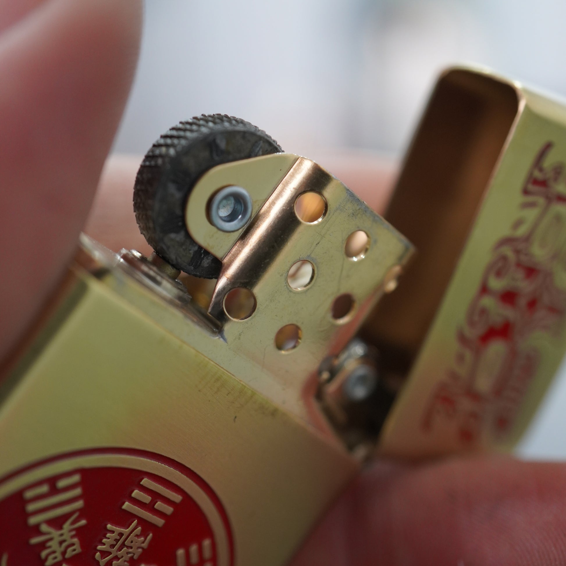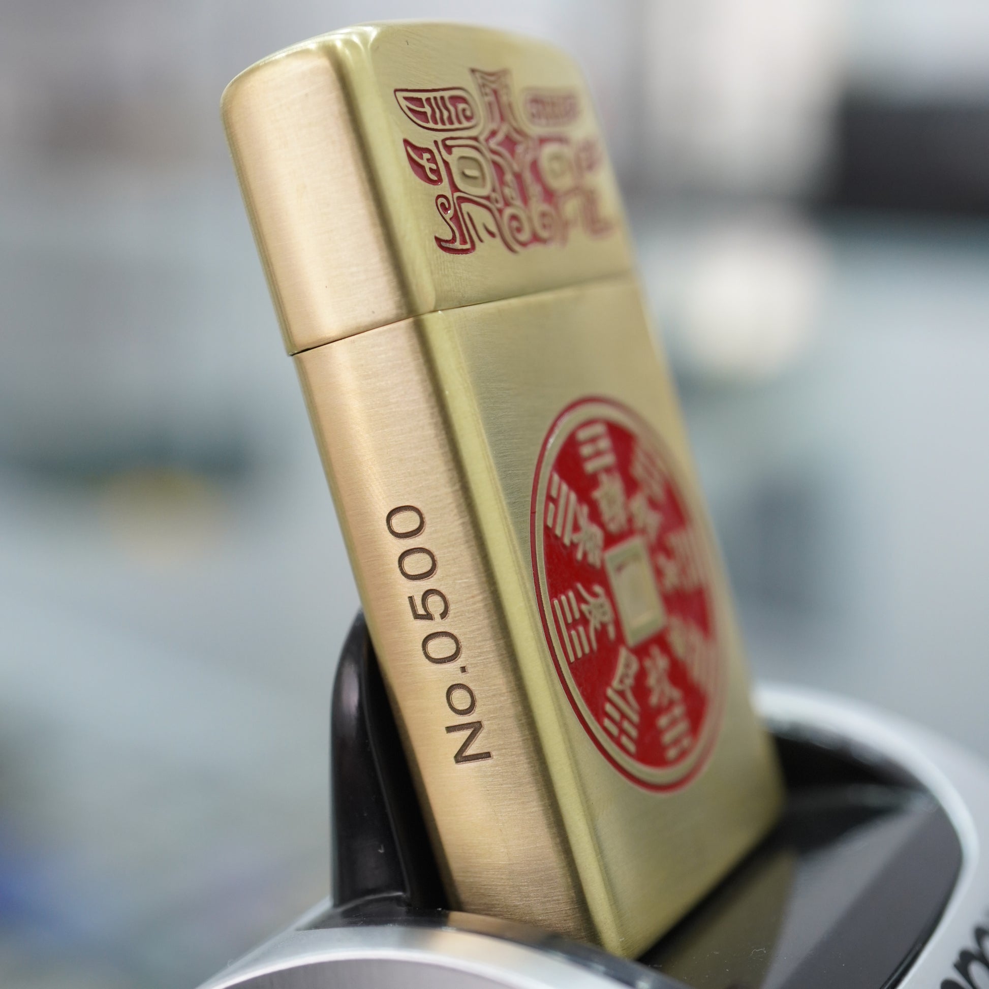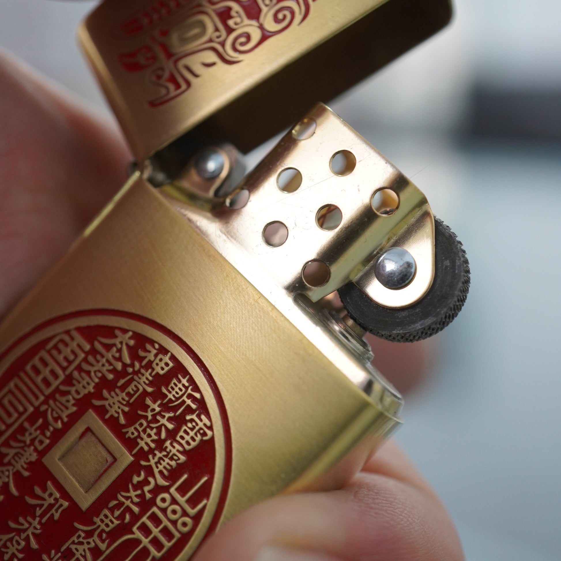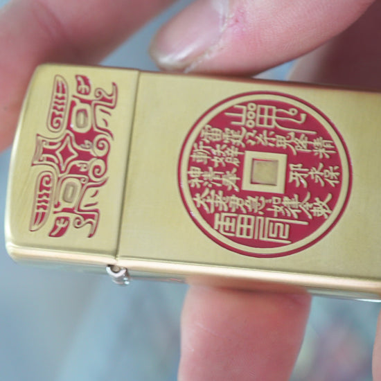 This intriguing Zippo lighter features a bright High Polish Brass finish, serving as a clean golden backdrop for the symbolic carvings. The design is specifically inspired by traditional Chinese numismatics and protective charms. The top section features the characters ???? (Shí Qián Shí Mei), meaning Ten Cash Ten Perfections, surrounding a circular Yin-Yang symbol. The lower, dominant feature is a large, circular ancient coin design, deeply etched and highlighted with a central red lacquer fill. The coin design includes intricate Chinese text and symbols, specifically referencing Shan Gui (Mountain Ghost) protective charms. This highly detailed piece is a fascinating collectible for those interested in Asian history, folklore, and protective artifacts.