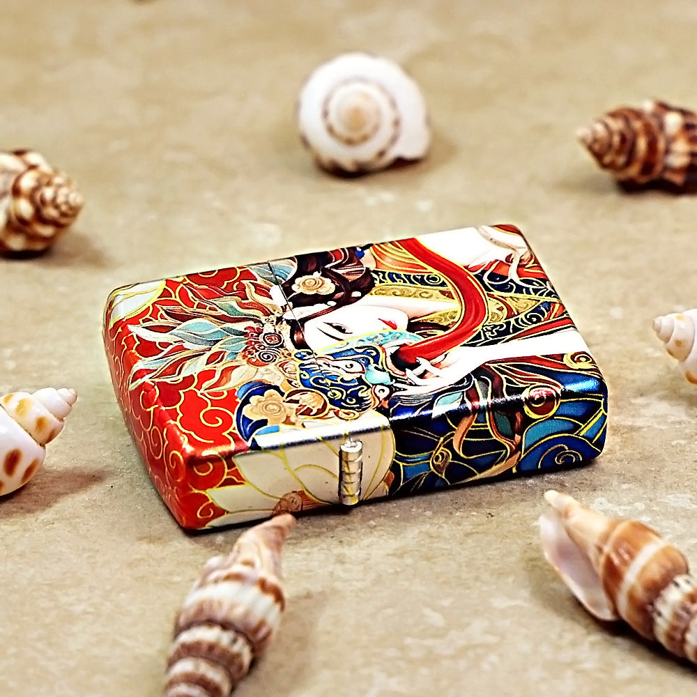 This Zippo lighter features a vibrant, full-coverage Color-Printed graphic over a metallic base. The artwork depicts a majestic figure, possibly a deity or an ancient cultural icon, adorned in elaborate robes and headdress. The figure holds a fierce, elaborate Demon mask with a protruding red tongue to the side of their face. The background is filled with swirling clouds in rich reds, blues, and golds, creating a powerful, highly detailed, and mythological aesthetic. This piece belongs to the Spiritual/Character Series.