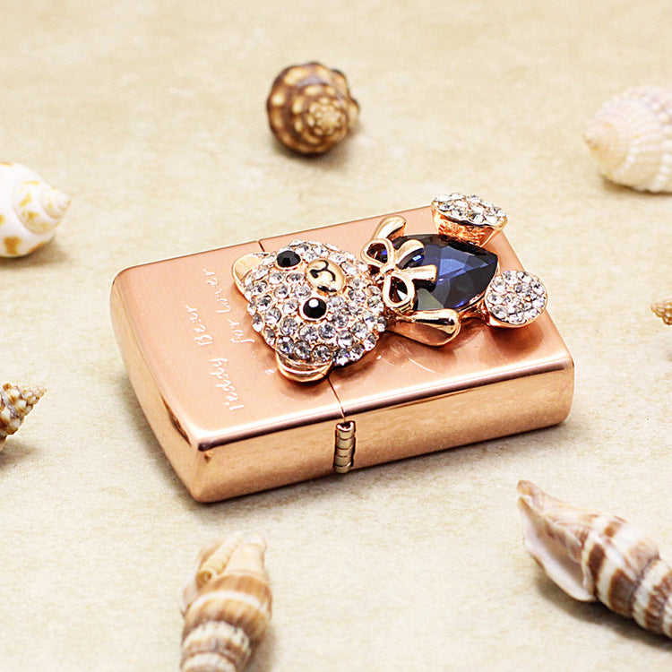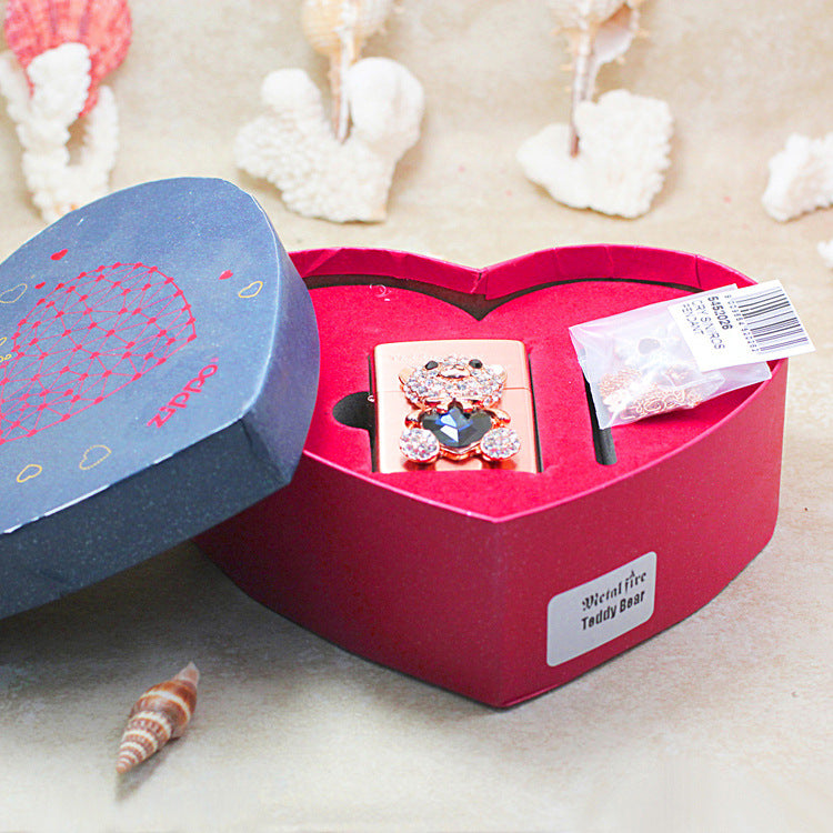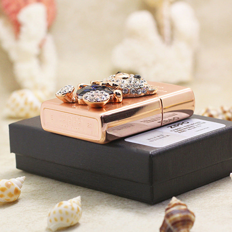 This Zippo lighter features a romantic and elegant design with a brushed rose gold finish on a standard base. The centerpiece is a decorative 3D teddy bear emblem, meticulously encrusted with shimmering white crystals on its head, ears, and paws. The bear wears a polished rose gold bow and holds a large, deep navy blue crystal shaped like a heart, symbolizing affection. The upper lid is delicately engraved with the cursive text Teddy Bear for lover, making it a perfect gift for special occasions. This piece combines the warmth of rose gold with the brilliance of jewelry-grade accents, creating a charming and sentimental accessory.