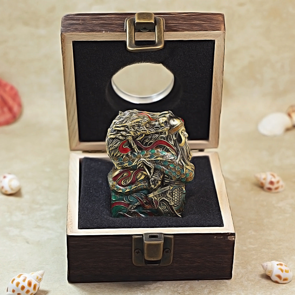This Zippo lighter features a decorative Silver-Toned finish with a contrasting Gold Background. The entire front surface is covered by a detailed Deep Relief Engraving of the Chinese God of War and Fraternity, Guan Yu (Guan Gong). The figure is shown wearing armor and holding his signature Guandao weapon. The design is surrounded by swirling Clouds and a fierce Dragon at his feet. This piece belongs to the Character/Warrior Series.