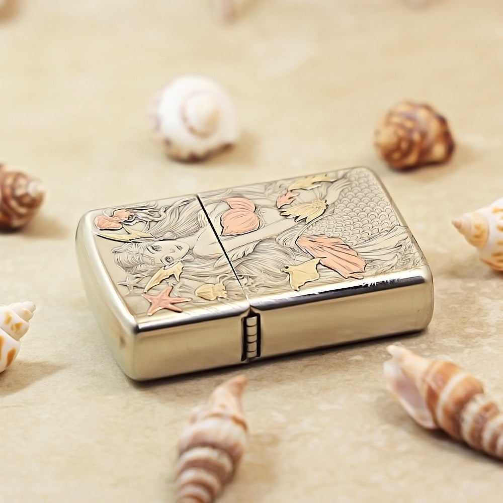 This Zippo lighter features a decorative Silver-Toned finish with Deep Relief Carving. The entire front surface is covered by a highly detailed illustration of a Mermaid figure. The design incorporates elements of the ocean, including a large, scaly Fishtail and various sea life like Starfish and jellyfish. The mermaidâ??s hair, tail, and seashell bra feature selective accents in a Rose Gold/Pink tone. This ornate piece belongs to the Fantasy/Character Series.