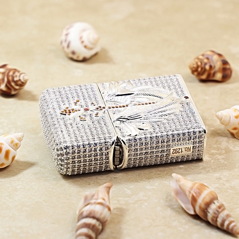Zippo Silver Full Crystal Pavé Guardian Angel Wings and Fleur-de-lis Shell Lighter - CM110
