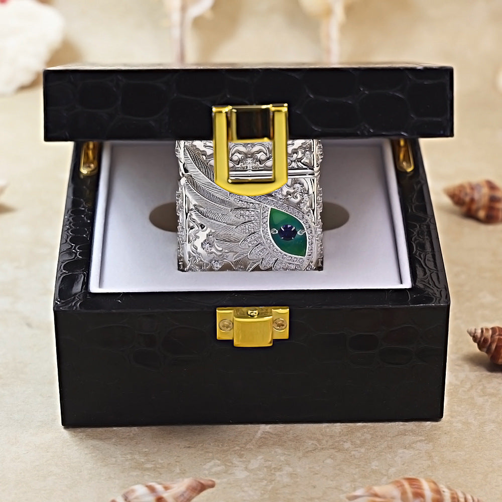 This Zippo lighter features a luxurious silver-plated shell case designed for the 205 model, showcasing a highly ornamental and ethereal aesthetic. The upper half of the shell is covered in an intricate openwork filigree of swirling vines, densely set with sparkling white crystals. The central focus is a large, striking blue eye motif nestled within a vibrant green and silver feathered wing that wraps across the body. The eye features a deep blue sapphire-like crystal at its center, surrounded by a pavé-set border of brilliant white stones. This combination of fine jewelry craftsmanship and protective shell armor makes it a standout piece for collectors seeking a mystical and high-fashion accessory.