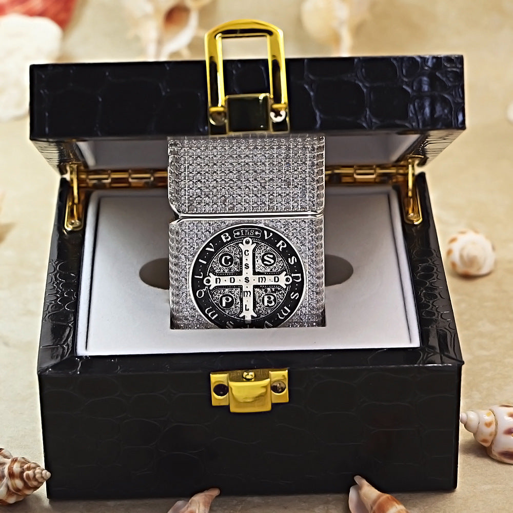 This Zippo lighter features a decorative, silver-toned Heavy Relief Case or thick emblem. The main body is covered in a dense, Textured Pattern that mimics being completely inlaid with small crystals. The center displays a large, circular, black and silver Medallion. The medallion features the Cross of Saint Benedict, with its characteristic four segments and inscribed Latin initialisms for prayer and protection. This ornate piece belongs to the Spiritual/Religious Series.